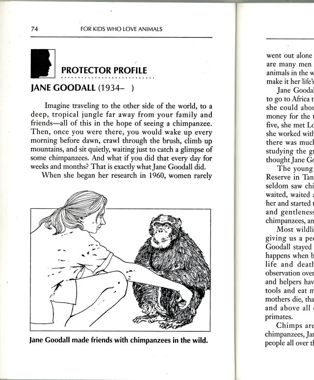 Jane Goodall was to write the preface to a book by Linda Koebner, For Kids Who Love Animals. I was asked to illustrate and faced a challenge of creating a likeness of Jane Goodall. Sketching a legend is a bit intimidating.