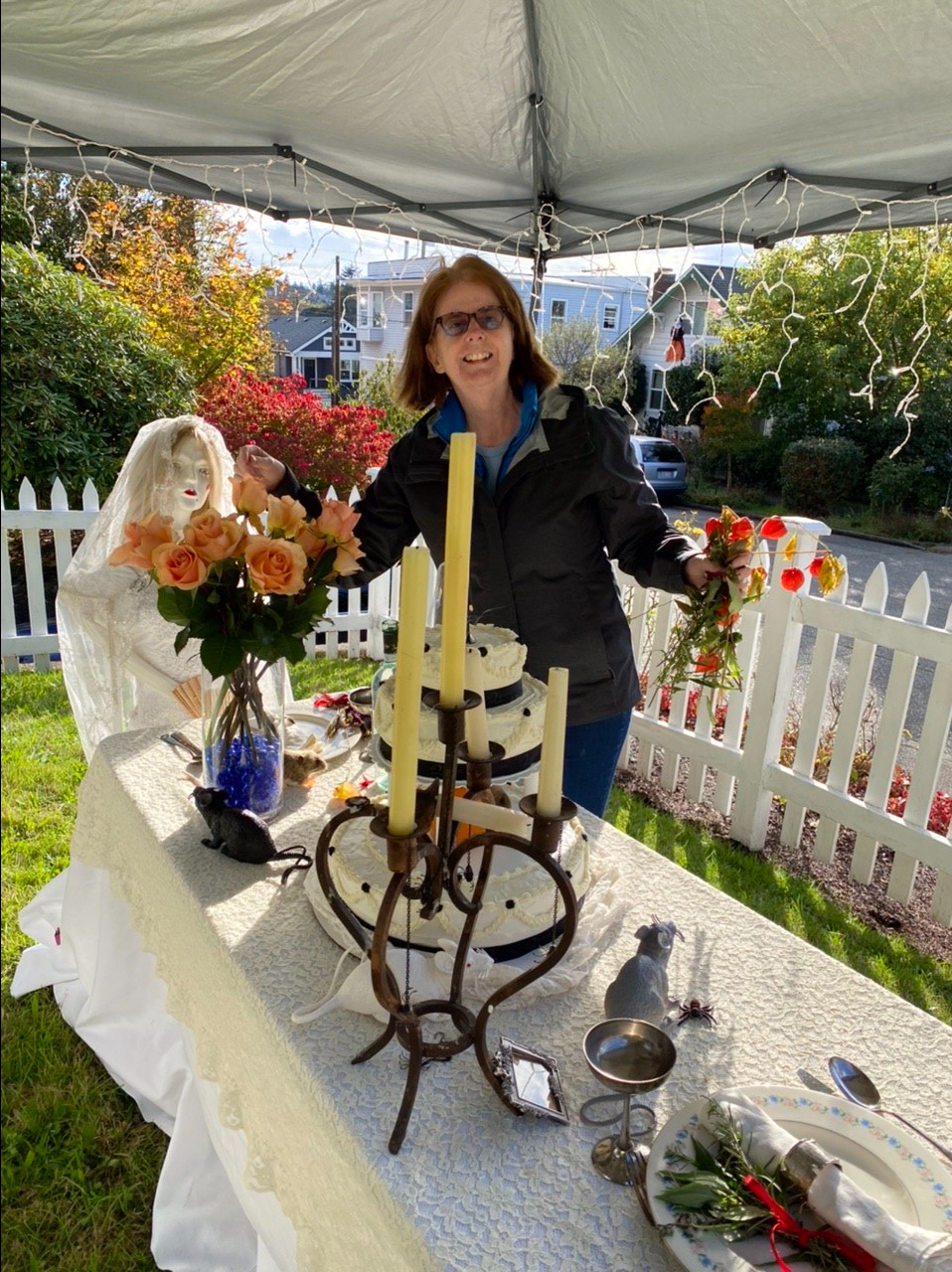 Michele applied for the street closure permit, we set up all her scenes ( Miss Havirsham, King Henry VIII and Queen Mary, Frida Kahlo, Headless Horseman, Ursula (Little Mermaid story), Ghouls and Goblins and Ghosts and more around the neighborhood, and linked up with the Ballard Greenways 6th Ave folks to celebrate, and at least make it appear that things were almost normal.