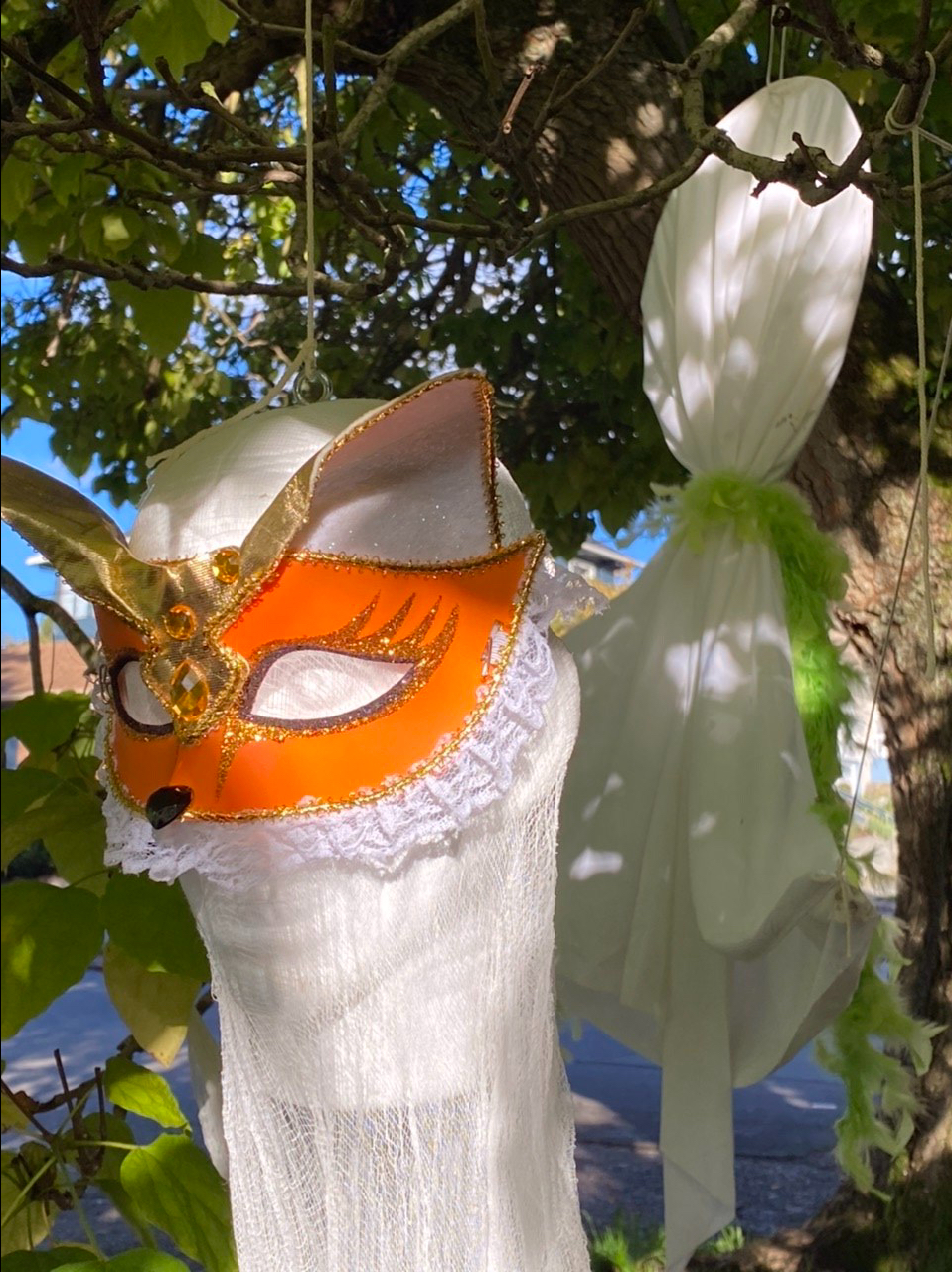 The 6th Ave Ballard Greenways folks set up a safety plan. Families took the east side of the street to head north from NW 45th to Market Street and took the west side to head south. For our block we posted “Please Wear Masks” signs. Three tables were set up in the street with the pumpkins (see above) and assorted bags of candies, while I staffed the candy shoot that Michele had decorated as a ghost. Full size candy bars slid down the 10 foot tube, making scraping sounds as they gained velocity and then shot out into little trick or treaters bags. This was a huge success and may return by popular demand next year. One tow-headed tike in a fireman’s outfit was totally mesmerized demanding a repeat performance. And then returning again and again to explain the wonder of the ghost spewing candy. Later it was reported that this event was all he could talk about on the rest of the Halloween walk.
