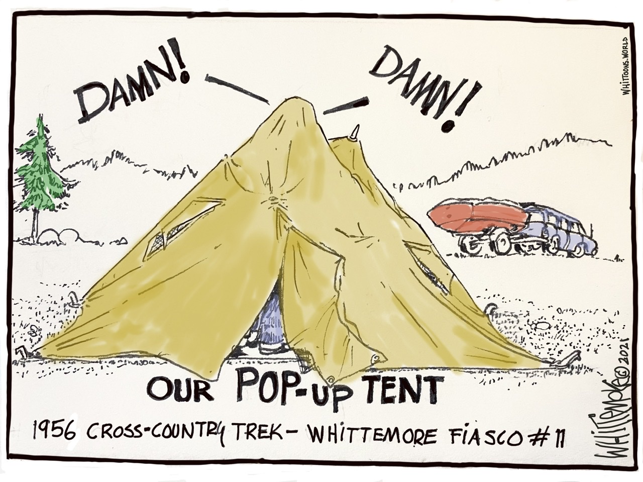 As mentioned, each evening was an adventure in curses as Dad set up the tent. My siblings needed to master putting up the pup tent. Rain was always a challenge. No one was to touch the tent walls or water would drip inside. There were drips and puddles and wet bags. Though sturdy, the tents could not handle a thunderstorm. We came back after visiting another historic site, and the saturated canvas pulled the stacks out of the sodden ground. More curses. Dad began to call such cataclysmic events – Whittemore fiascos.