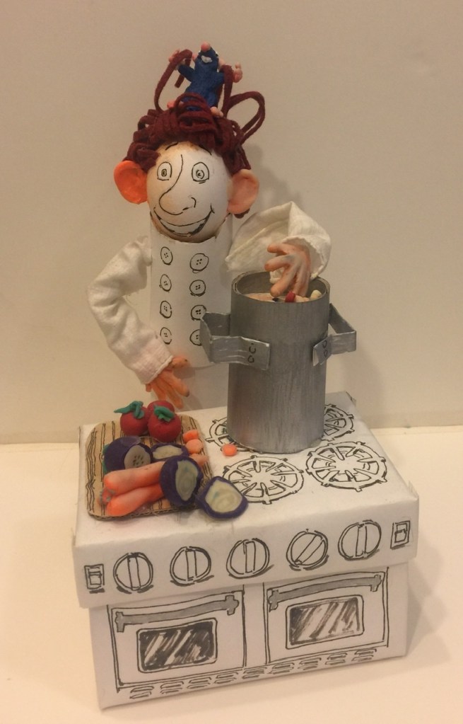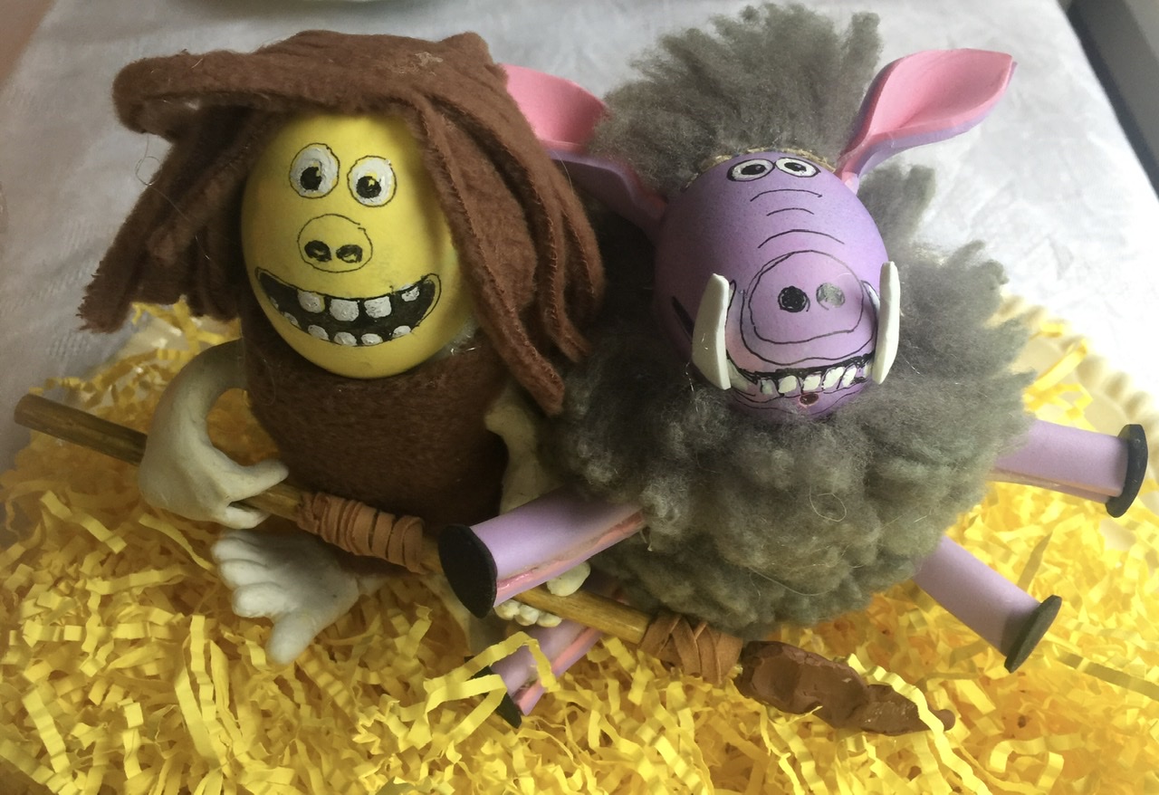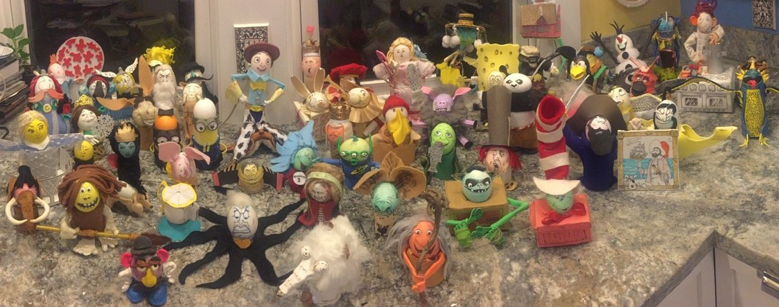 On a yearly basis, as we approach Easter, I move from drawing two dimensional cartoon characters to molding three dimensional characters inspired from film and literature. The egg is the fundamental building block for these creatures…carefully blown eggs.