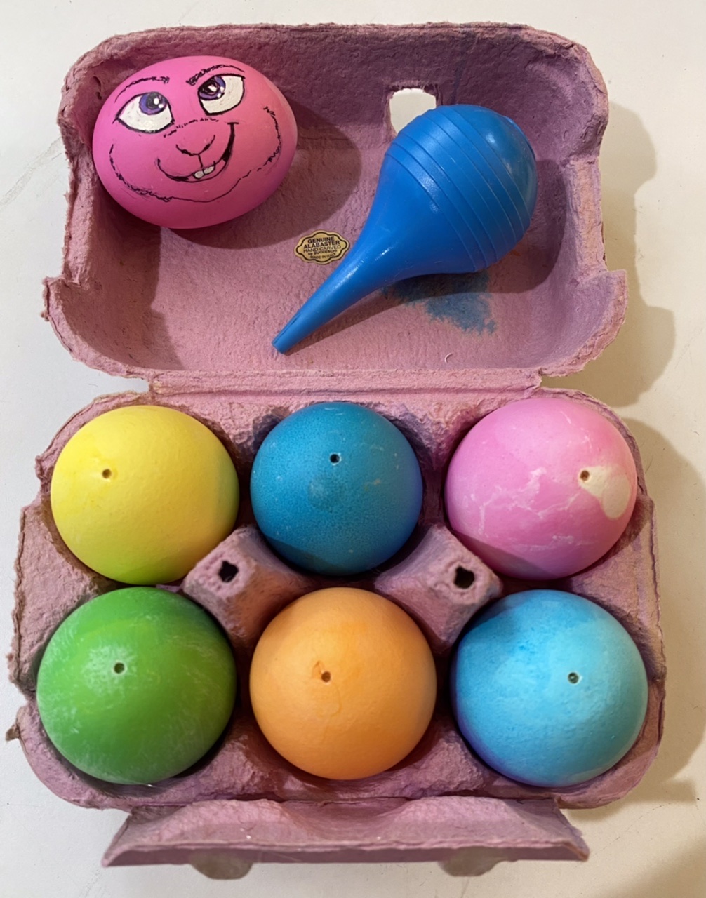 In blowing eggs, I also learned not to bust a gut. After drilling fine holes at both ends of the egg with a needle-like implement, blowing out the fluid was an ear popping experience that brought stars to my eyes…and often led to cracked eggs and a gross mess. I found the right tool – a baby nasal aspirator that does wonders extracting the egg yolk and whites.