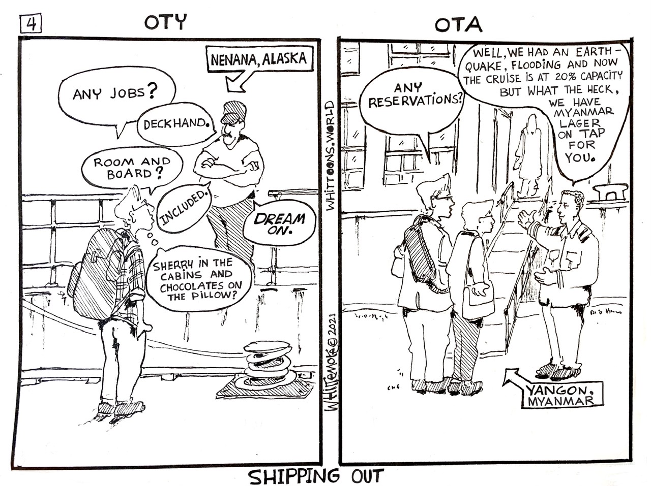 OTY: I had been a whirling dervish gandydancer pounding spikes on the Alaska Railroad; a frost bitten doodlebugger laying cable across frozen tundra with Petty Ray Geophysical on the North Slope; and the Night “faker” Baker kneading dough into submission at the McKinley Park Hotel. I yearned to be a river rat working as a deckhand for the Yutana Barge Lines. I had made several visits to the Nenana dock and had received multiple rejections. This time I made the “elevator” pitch loudly over the rumble of huge Diesel engines idling. My pitch: I had experience as a deckhand aboard the Manutea in the South Pacific, so I could demonstrate some ability at handling the lines, sheets, ropes…whatever. I could identify the port and starboard sides of the towboat. Turns out, the crew was short handed. They were desperate, so they hired me.