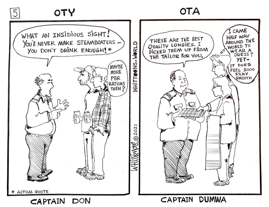 OYA: I have worked for or sailed with four Captains, and Captain Dumwa was the kindest of them all. I held the hand of a Cook Island Captain suffering from early stages of dementia, deflected the creepy paternalism of a racist Aussie Captain, and avoided antagonizing the short, authoritarian bully Captain Don. Captain Dumwa was so kind that you had to avoid mentioning a desire or he just might fulfill it. Shopping for longies, I did not expect Captain Dumwa to be a fashionista, but he knew where to find the best quality and who had an excellent tailor. And he really did deliver the longies to us on board. In return, I volunteered to suffer through modeling the traditional Burmese attire in front of the passengers after supper one night. Given my tall stature and thin build, I was a fun-house mirror reflection of the Burmese look. I spun and my crowd was amused. But Elite Model Management did not get in touch.