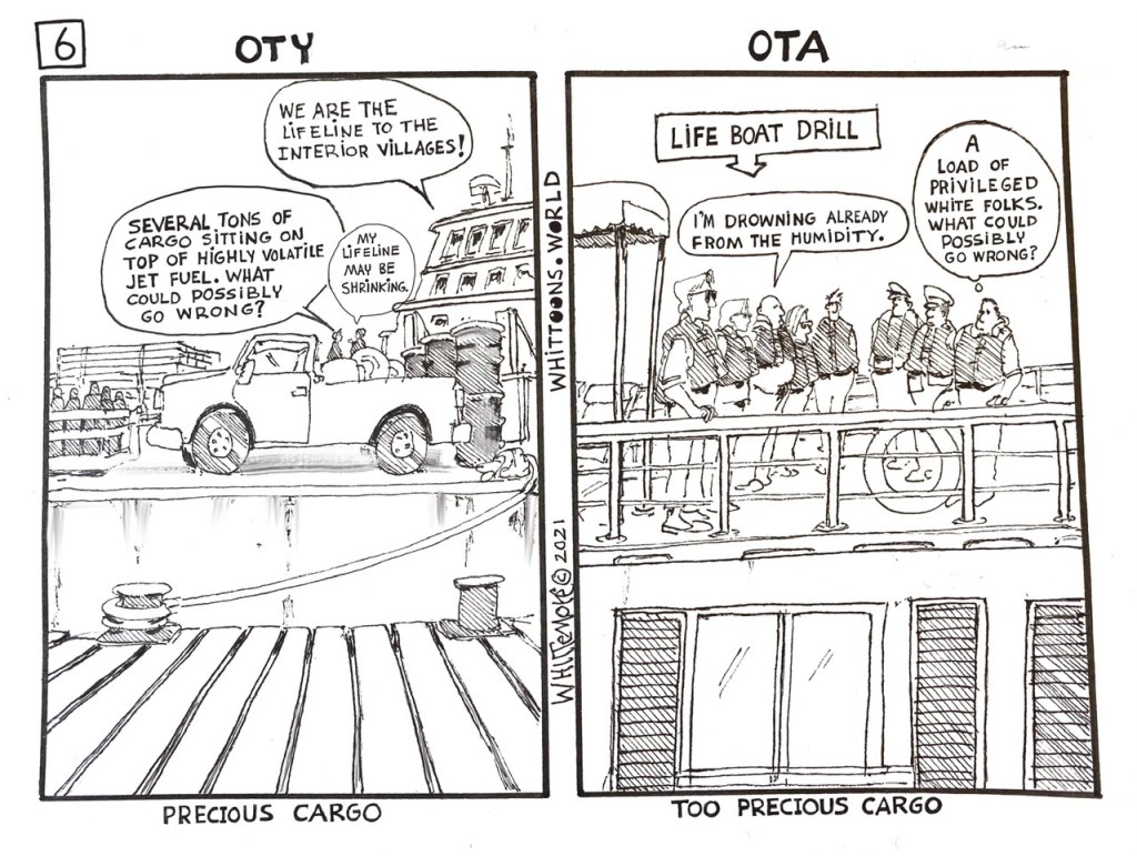 OTY: We would be pushing hundreds of gallons of jet fuel along the rivers, and layered on top of the barge fuel tanks were stacks of fifty gallon drums of gas, enough lumber to build a few houses, a truck and car, and crates of household goods. No smoking please. And could we steer clear of thunderstorms. We were riding a powder keg, and I lacked life insurance. For many of the villages down river, major freight only came one way – by barge. Since the Yukon and Nenana freeze up in the winter, summertime is the window of opportunity for transporting needed materials. (Amazon was not shipping overnight…yet. Drone delivery might save the day.) If the order is wrong, the return policy might get a little complicated. Wait ‘til next year.