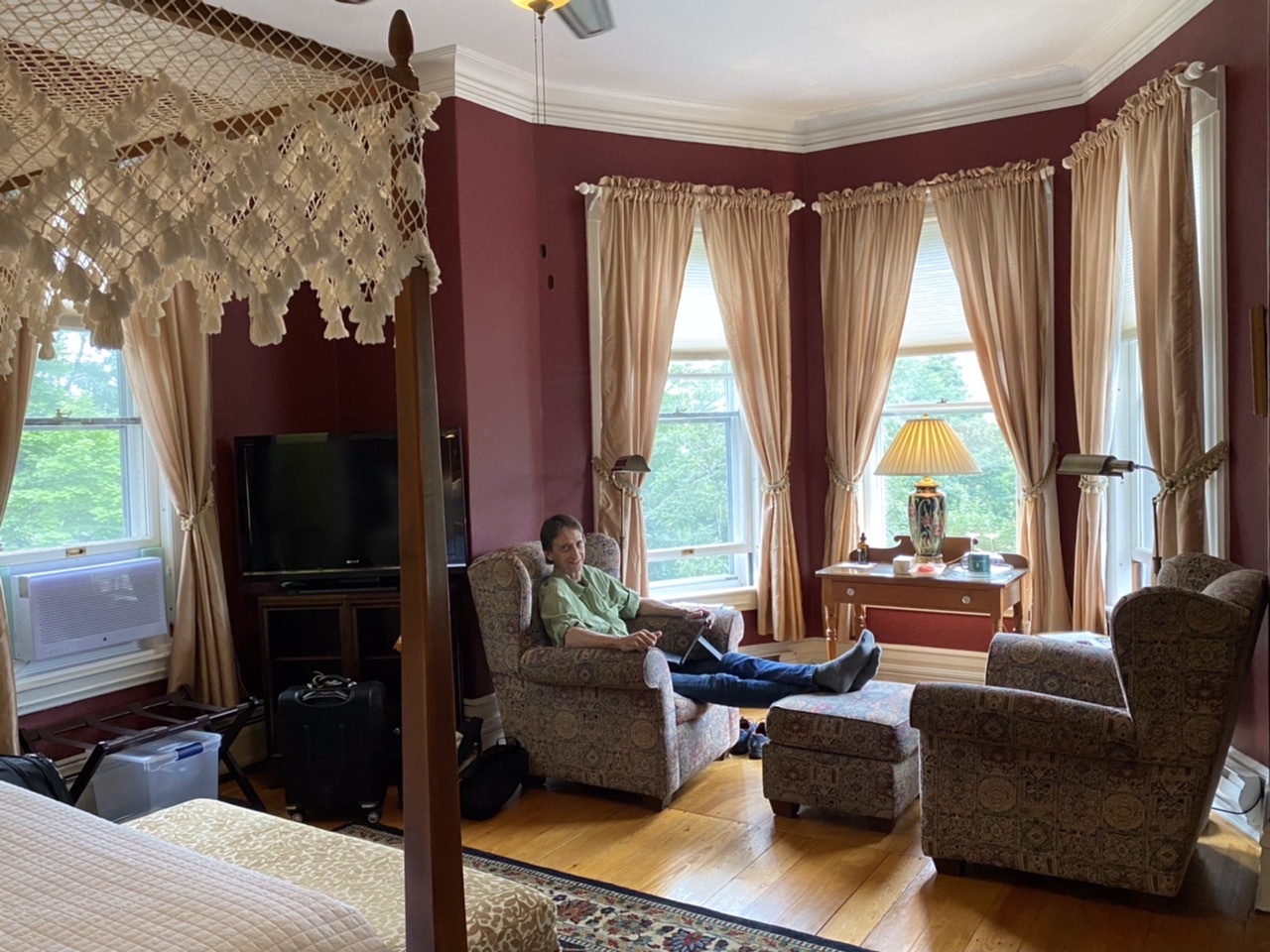Our next refuge was to be the Willard Inn in Burlington Vermont. I had booked the only room for miles, and did not realize the one room available had a grand bay window and view of Lake Champlain. Breakfasts are included and they were extraordinary. Presented in baskets to take to the conservatory or your room, the selection provided over the week included French toast and pancakes with a variety of ingredients and toppings, and various egg and mash blends plus muffins/scones, fruit juice, fruit and fresh coffee. Granola was available but with these options, I had to go for something to pour Vermont Maple Syrup over.