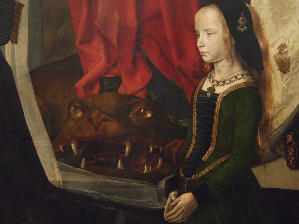 This is only a small section on the right panel of the Portinari Triptych/Altarpiece. This is Portinari’s daughter Margaret looking a bit like Hermione at Hogwarts dealing with monsters. But this sums up the dynamic of most Holloween horror shows: innocence and savagery, purity and profanity, good and evil. It is not looking great for the little one.