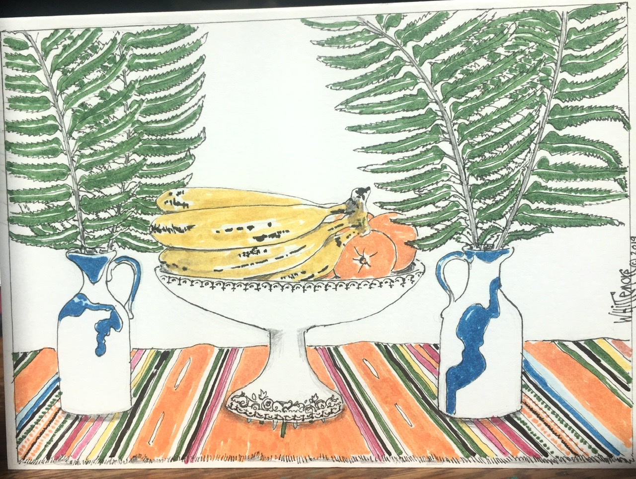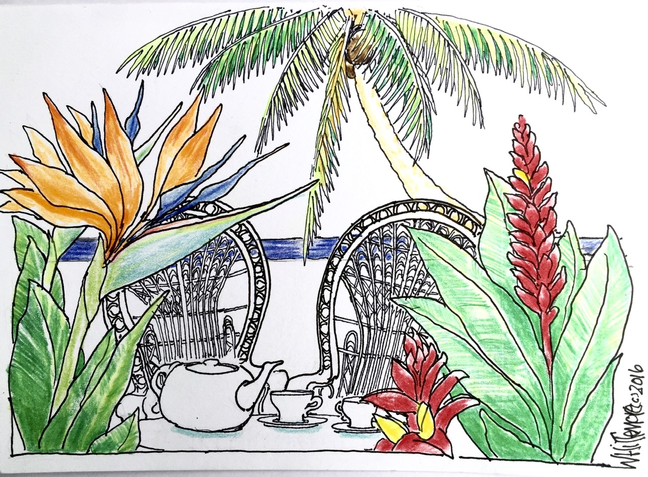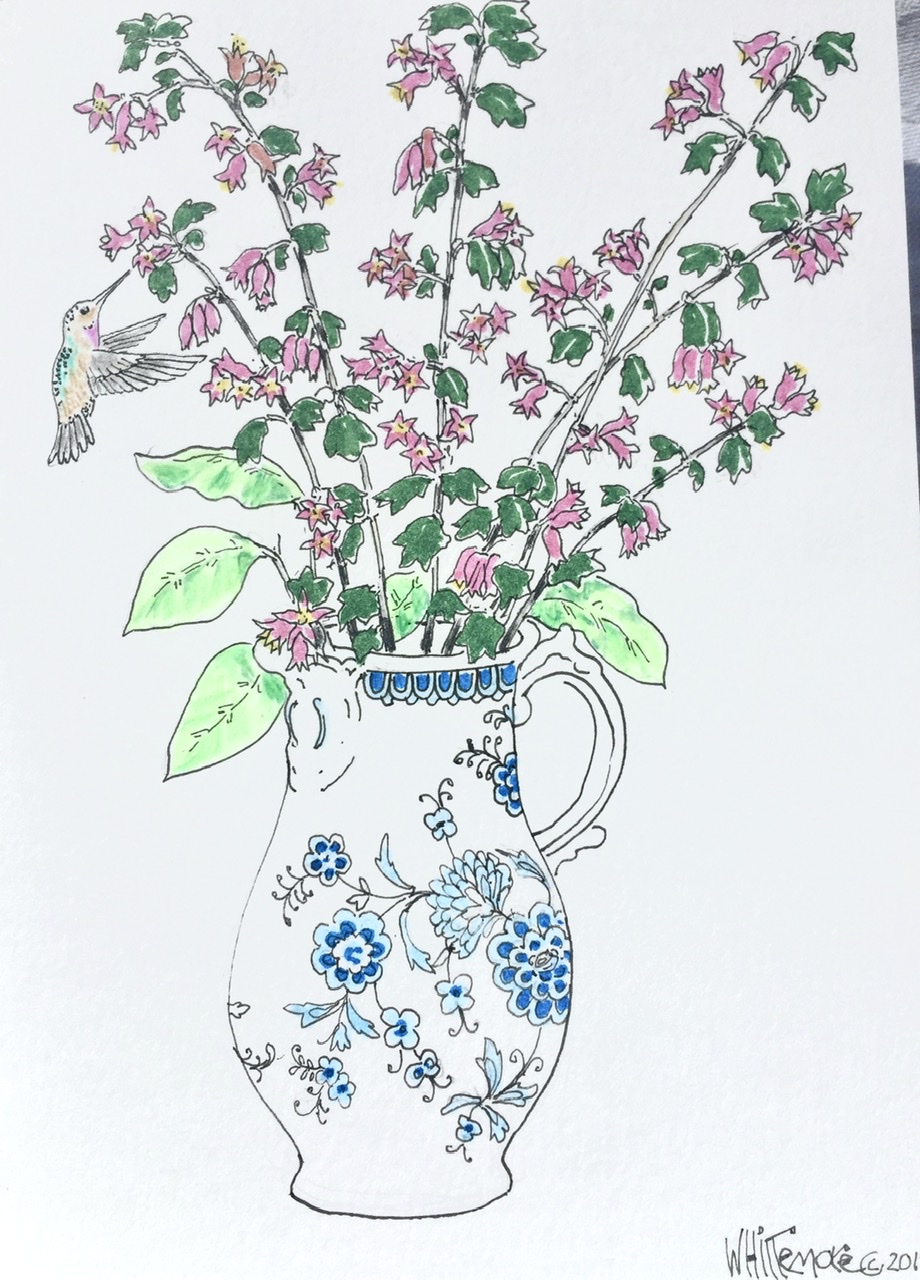 When friends and relatives are generous with a gift, whether on a birthday, holiday, after a move into a new home or other special occasions, then I try to show our appreciation by drawing on a Thank You note. I am including some examples from the past and present. Most compositions are original though sometimes I use a familiar image e.g. the Morton salt girl, or reference some art, e.g. Picasso’s Seated Woman in Red Armchair and Bernini’s fountain in Rome.