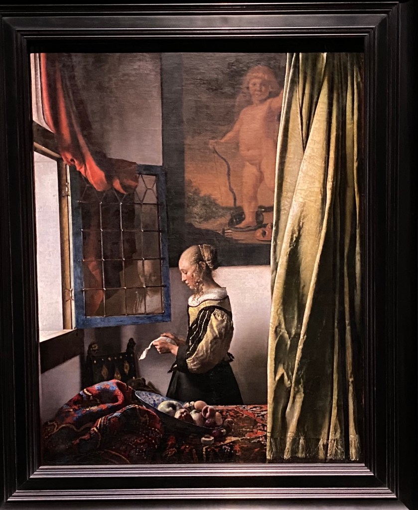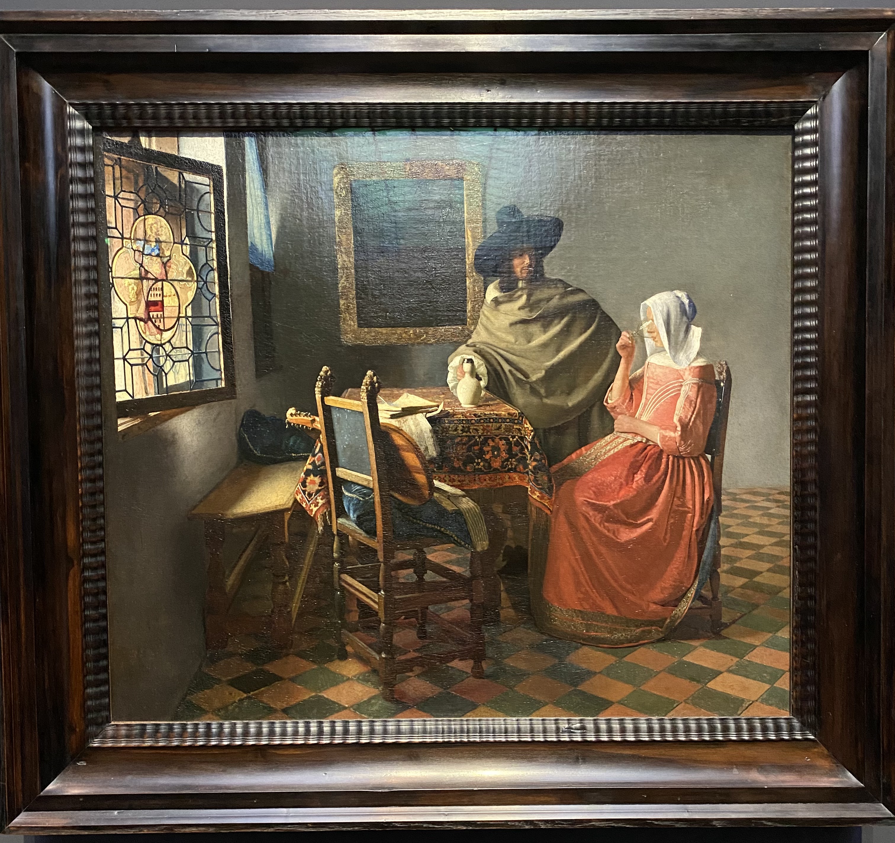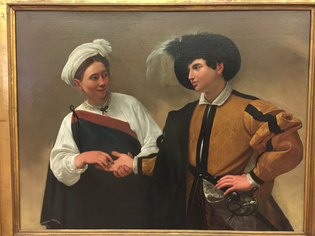 We do not have quite the fixation on Vermeer that my sister-in-law (Michele’s twin) and her husband. They are aiming to see all Vermeer paintings within their lifetime and this exhibit made that Bucket List goal achievable. We , on the other hand, are seeking all Caravaggios – (Oh, just because he was such a rogue and died young like many rock musicians in our time. And of course his use of light and renderings of subjects is extraordinary.) And we even came upon one in the Louvre by accident, The Fortune Teller, later in our trip.