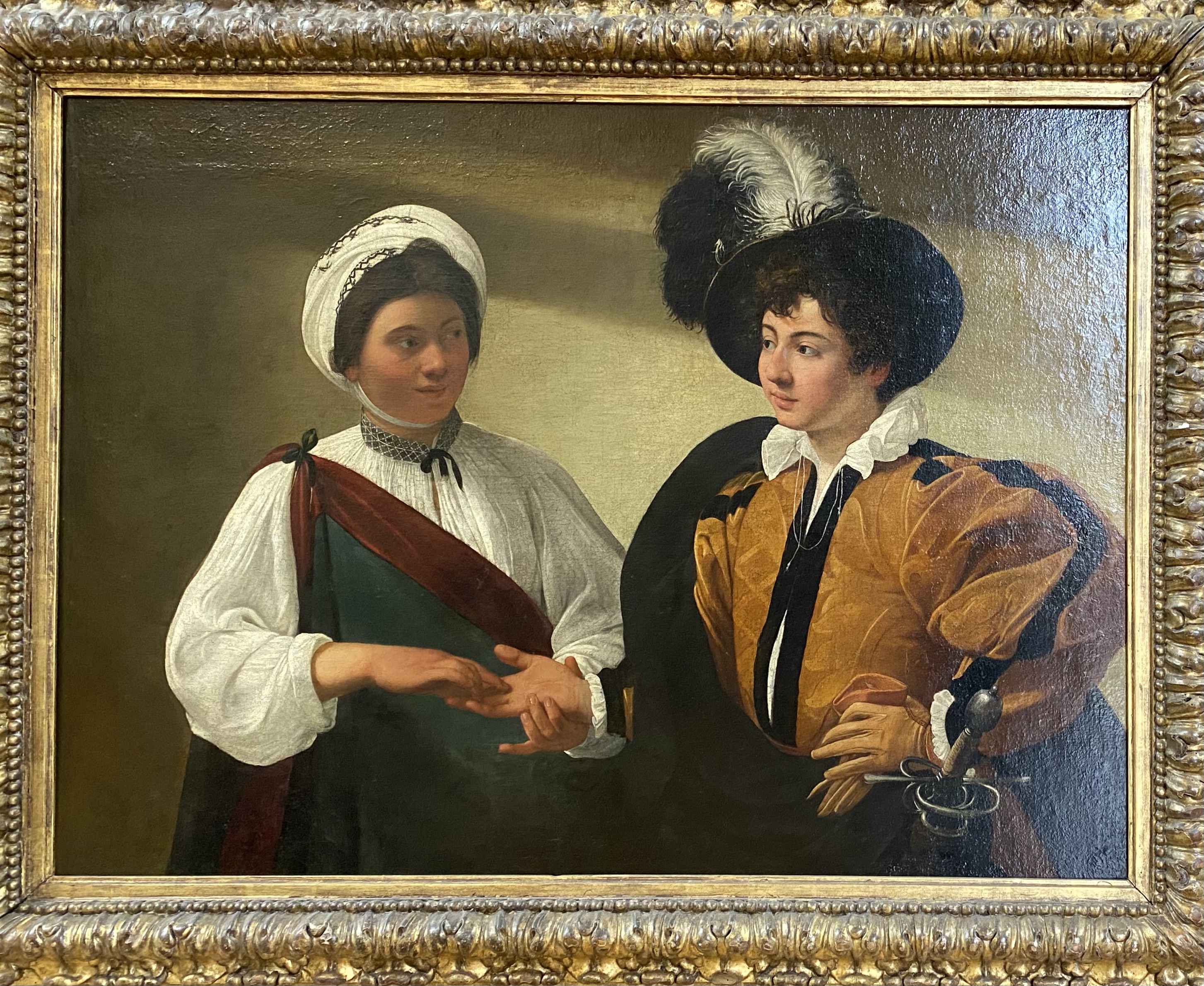We do not have quite the fixation on Vermeer that my sister-in-law (Michele’s twin) and her husband. They are aiming to see all Vermeer paintings within their lifetime and this exhibit made that Bucket List goal achievable. We , on the other hand, are seeking all Caravaggios – (Oh, just because he was such a rogue and died young like many rock musicians in our time. And of course his use of light and renderings of subjects is extraordinary.) And we even came upon one in the Louvre by accident, The Fortune Teller, later in our trip.