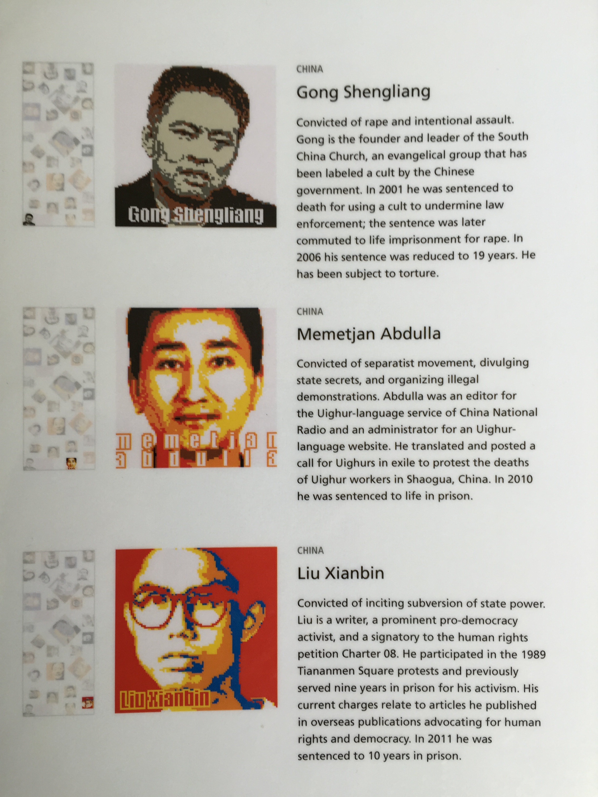 Legos rule! Such varied uses for conveying messages through art. In 2015 we headed to San Francisco to see the Ai WeiWei exhibit on Alcatraz. One large warehouse space floor was covered with depictions of political dissidents and prisoners around the world…all in Legos. Each one had been numbered and shipped to the US to be assembled since, at the time, WeiWei could not leave China.