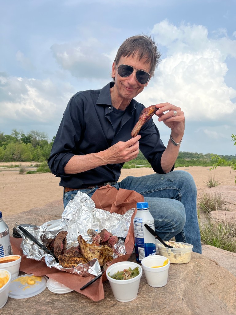 We celebrated by going to Coopers BBQ, standing in line with a crowd of voracious carnivores, selecting our cuts viewed through a cloud of savory smoke. Having avoided the End of the WOrld as we know it, everyone wanted to get back to their Neanderthal roots and have a feast. Since no cave was available, we headed back to the sand bar. We had the Llano River setting to ourselves now (though only about 15 people were up and down the sand bar during the eclipse) and devoured the meat with gusto.
