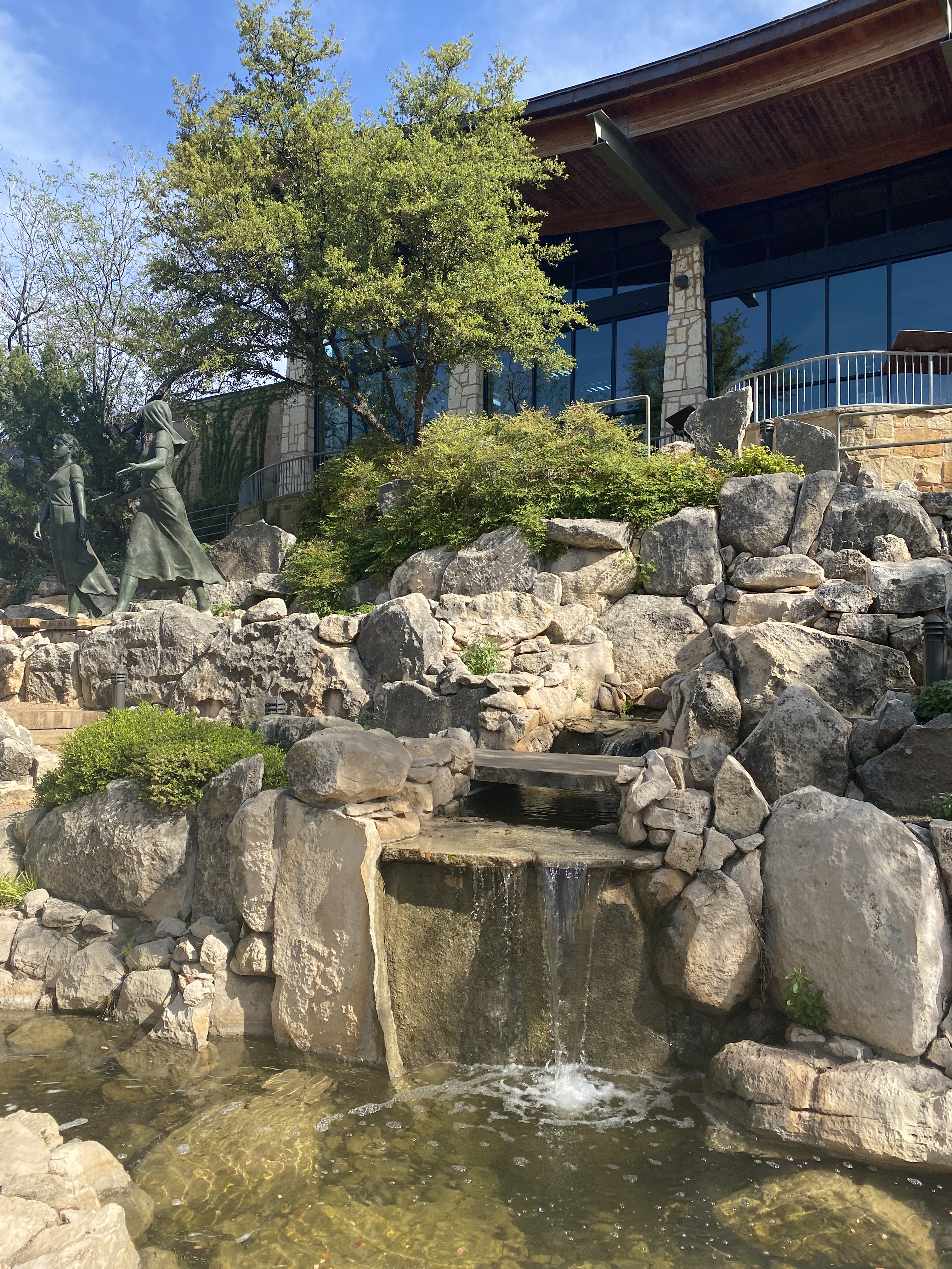 The San Angelo Art Museum with its swooping roof sits above the Concho. An artificial cascading waterway weaves down channels below to the river walk.