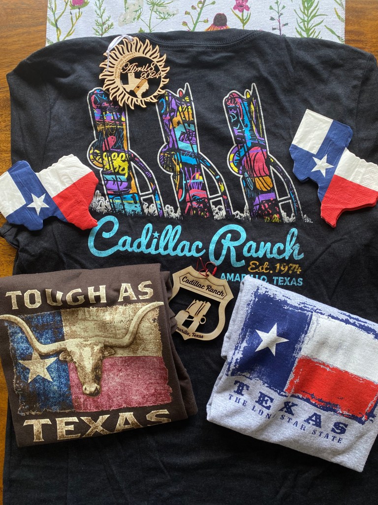 Anyone can be a tagger at Cadillac Ranch. For a few dollars, you can buy spray cans at the trailer near the entrance, and leave your mark for posterity…or until someone else splatters a sign over yours. We avoided tagging and inhaling paint fumes at the windy site. A knock-off road side attraction offered up some small T-shirts for grand nephews and nieces. (We try our darnedest to help the kids develop artistic appreciation…even for Low art.)