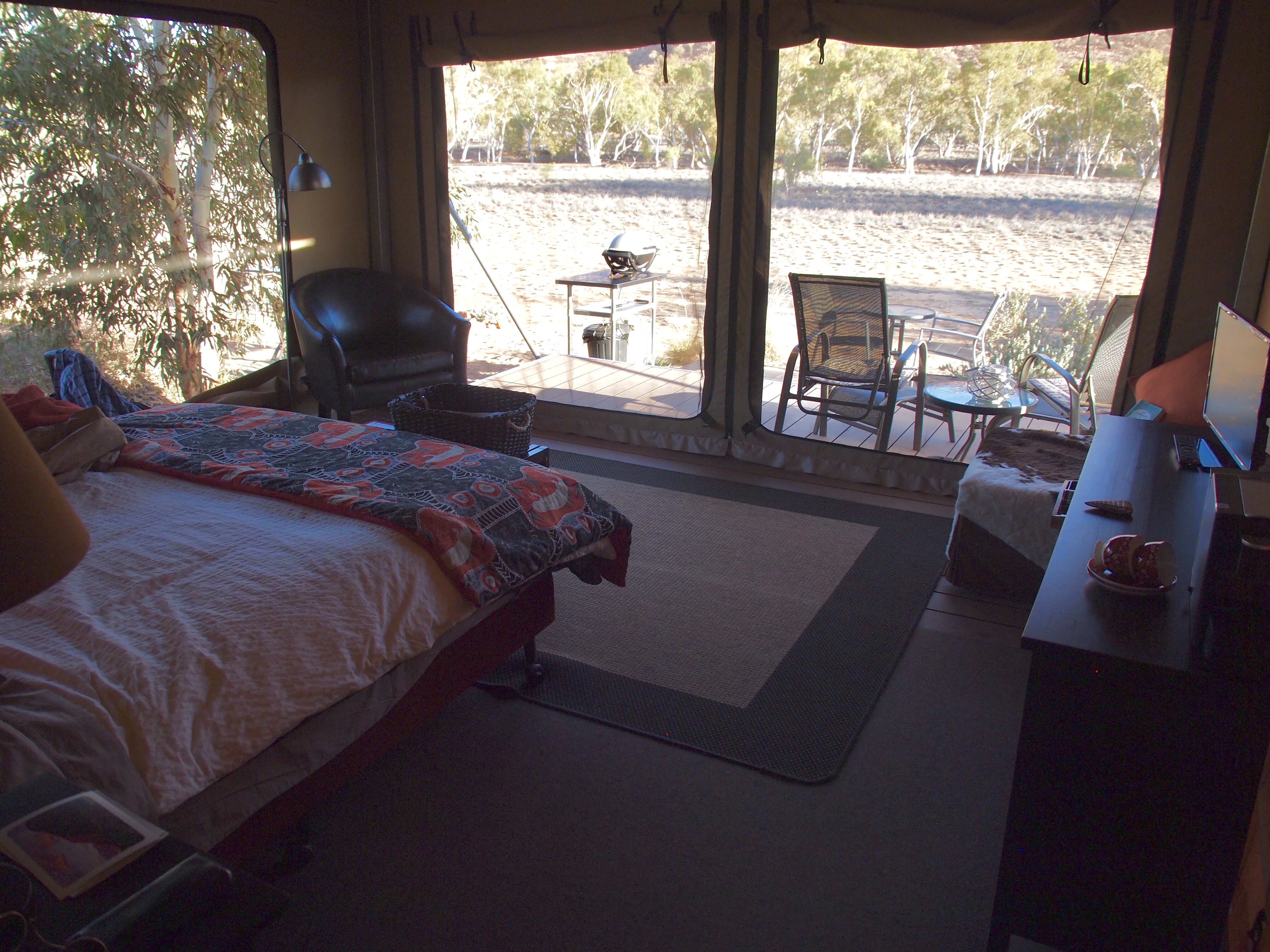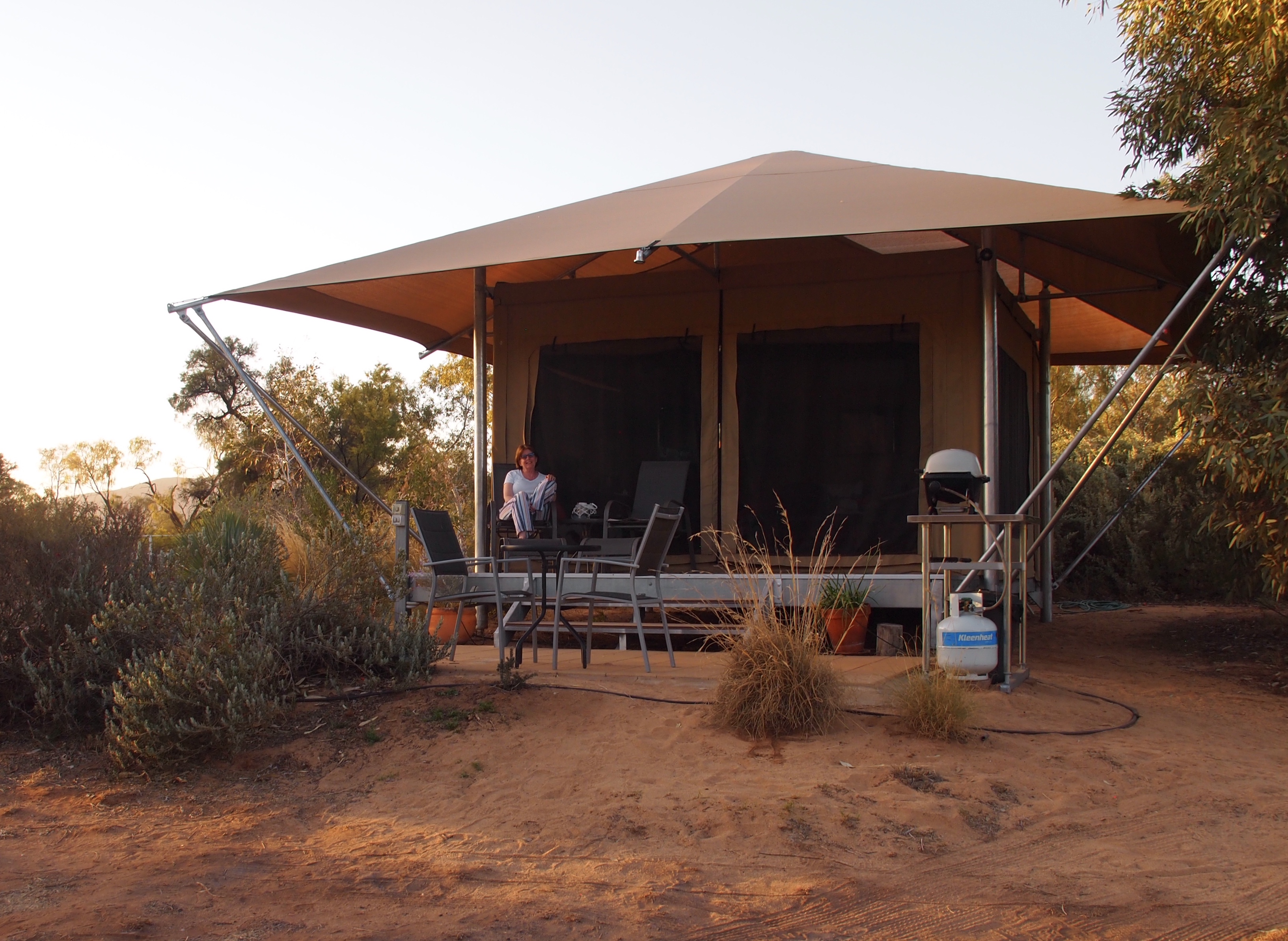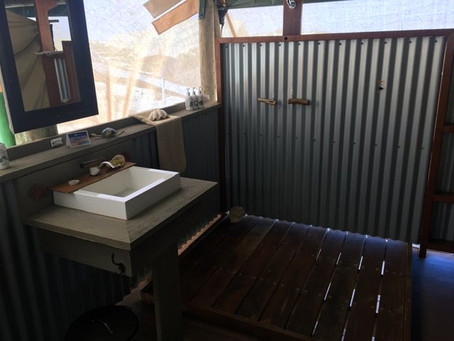 Our tent, though not as well appointed as Sqweakywheel in Alice Springs, was eco-friendly with a compost toilet, recommendations for low level water use and minimal lighting. Glam is in the eye of the beholder, and if sitting on a composting toilet in an open air bathroom is too primitive for you, then this is not your slice of heaven. Having worked in the Great Sandy Desert and lived in a large tent with bunk beds, this still seemed upscale.