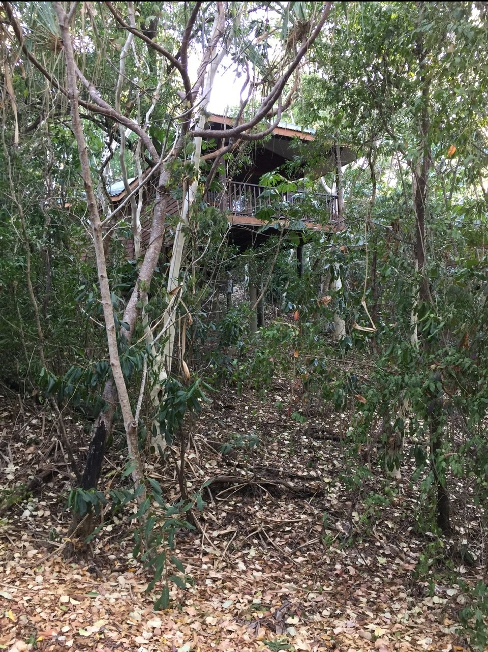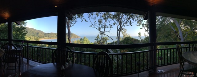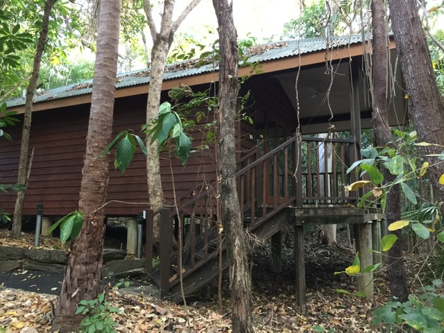 A few miles south of Port Douglas on the Captain Cook Highway is Thala Beach Lodge and the Thala Beach Nature Reserve. Michele had managed to get us a three night deal at this rather expensive retreat. Our humble cabin (#70) was on the lower slope of the promintory, elevated on posts giving it a tree house effect from the porch. On top was the lodge, dining area and pool…and some pricier cabins with views.