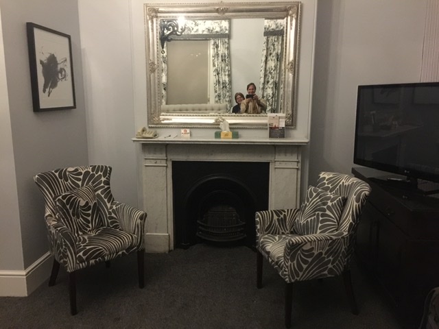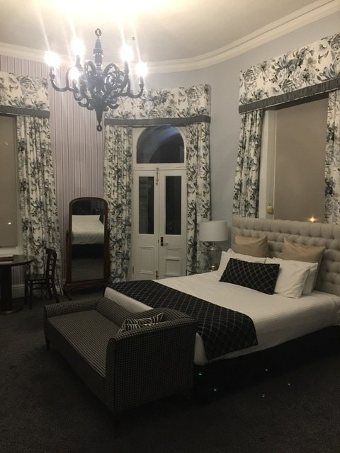 We sampled a few rooms over the three nights we stayed at Largs Hotel. On first entering our second floor corner room with a view of the water and access to a lovely porch…I noticed the throbbing sound of a base line from the music in the bar below. Not ideal for rest and relaxation so management kindly switched us to their suite for a night, complete with conference room, four poster bed and a jacuzzi. Not a bad upgrade.