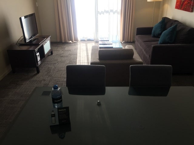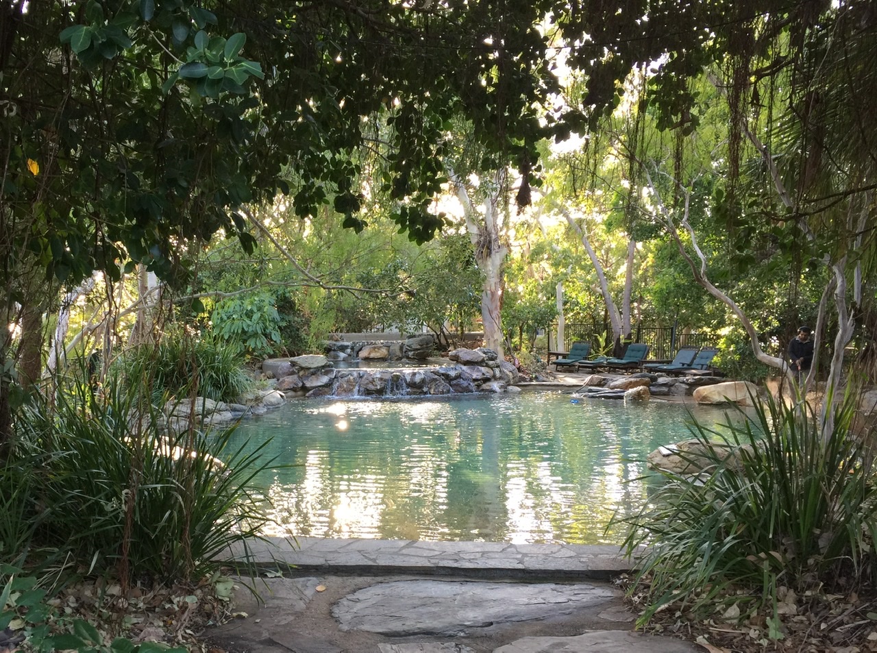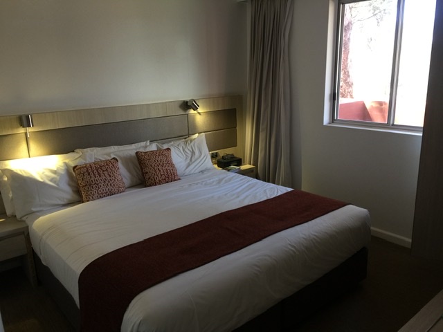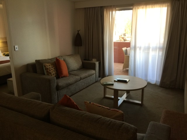 All the hotels and the camp ground is in one large complex, as well as the restaurants. So you are confined to the grounds so to speak. Our room was spacious with a living room, kitchen and laundry facilities, so no complaints there. The pillows on the couch tried to reflect some aboriginal patterns. We faced north so we stayed cool in the shade. Our walled patio offered views of the parking lot and scrubland beyond where a few brave souls ventured under the mid-day sun between hotels and restaurants.
