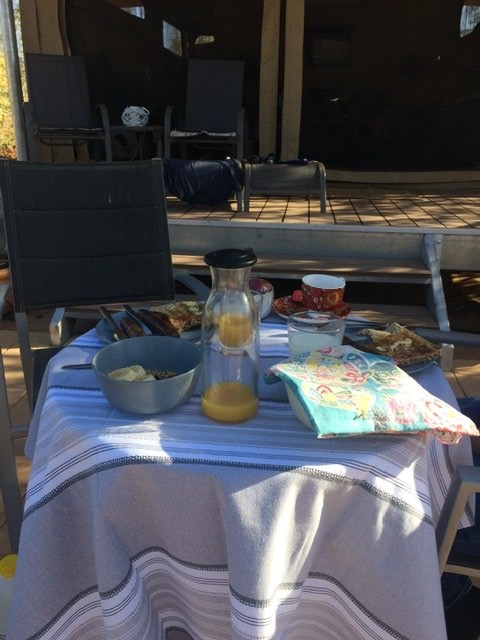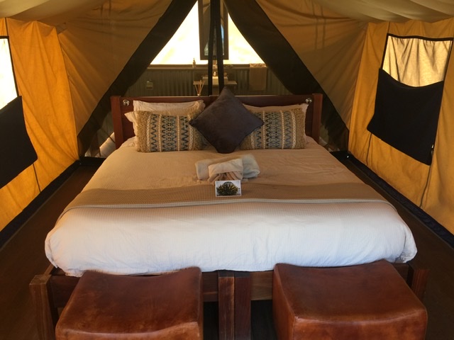 Dodging road construction vehicles, and taking multiple detours, we managed to avoid dinging the rental car exterior. We took a left at the camel riding ranch and pulled up to the Squeakywheel Boutique Tent B&B…just past the windmill. We would be the only guests the first night. The tent offered a large bed, mini-kitchen with fridge and sink, a roomy bathroom with shower and a barbecue out front. So cool.