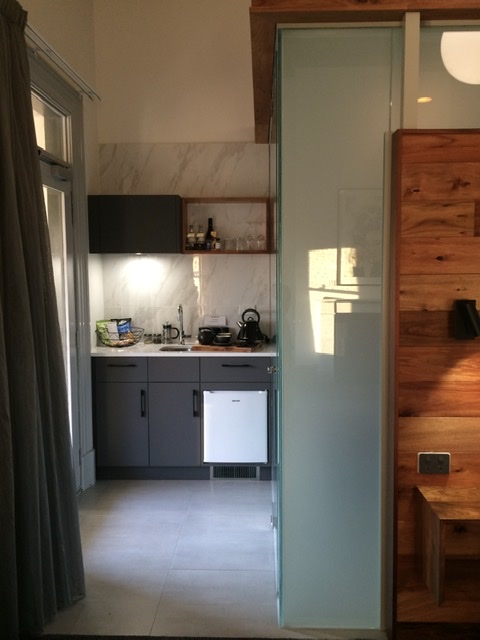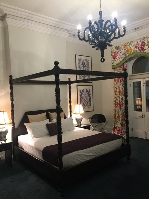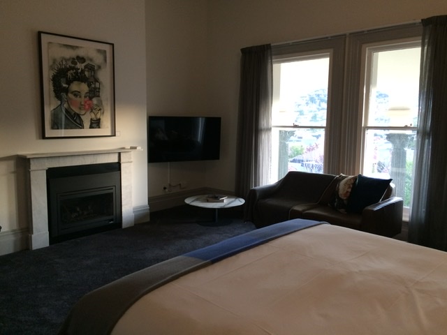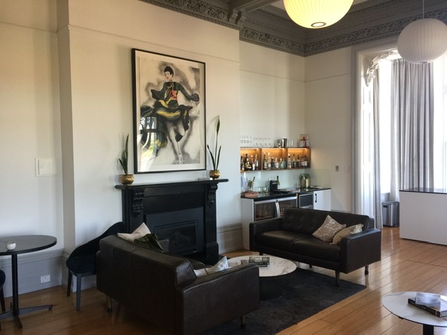 This grand hotel stands out as an extraordinary mansion conversion in Hobart catering to tourists. Large rooms have been retrofitted with fully equipped bathrooms, inserted into the space, …with a glass door and a wall that goes opaque at the flip of a switch. Gas inserts provide a cozy fire…once you deduce how to get that switch to cooperate.