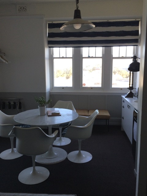 The room came with a sitting area, dining table and four chairs (a little worn but stylish mid-century) and a giant bed with a massive window looking out on Headland Park (where we just had our nap), Balmain, Goat Island and Walsh Bay criss-crossed by commuter ferries.