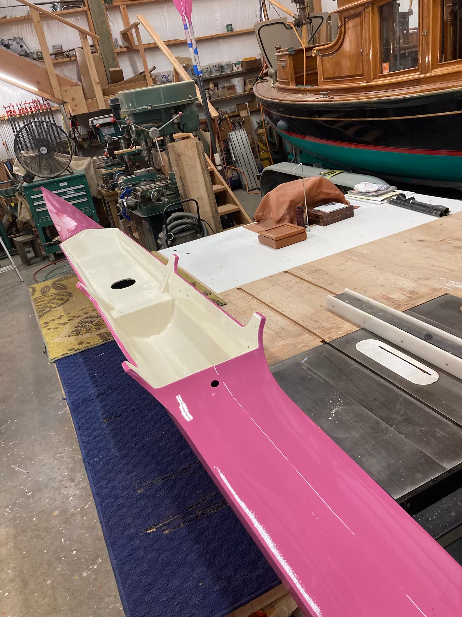 Just when Ben thought he was done with boat repair, I dropped this project on him. Ben was not going to waste his time if there were any fatal flaws in the hull, so he began his research on the boat. Only to find out that when built in the 80’s this design was the latest in carbon fiber hulls, and was a racing shell. (Typical of my dad to invest in the latest for his passion.) The manufacturer is still around and parts were available. Ben sent a scope down the inside of the hull, and no cracks so he committed to the work ahead.