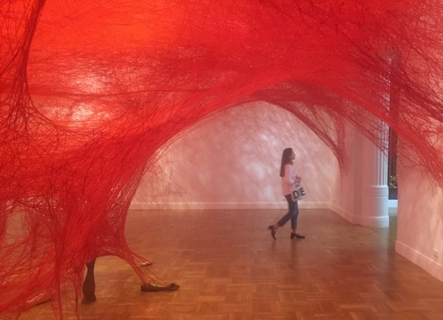 First impressions are that you have just walked into some Freddy Kruger abattoir (note the body parts on the floor. The network of red strings (that took two weeks to install) like veins are shaped like heart ventricles through which you move like Ant-Man. By coincidence a visitor walked through with a bag with the work DIE printed on it in bold letters. Be afraid, be very afraid.
