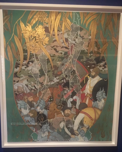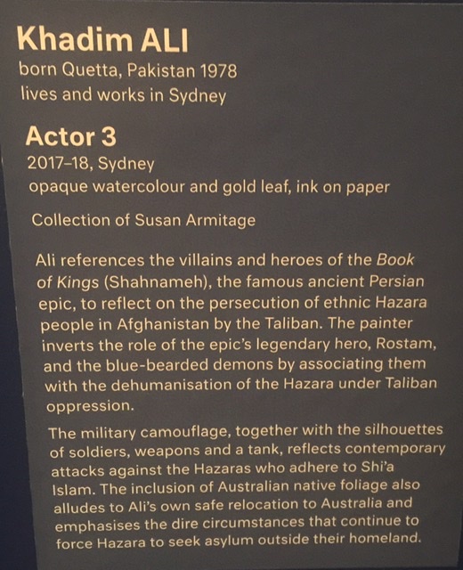 I was finding the work of Khadim Ali fascinating given his immigrant history and ties to the Hazara people of Afghanistan. His integrating of the characters from the Book of Kings with the horrors of war and references to his new Australian sanctuary is powerful. I only saw Afghanistan during a rare period of peace during the 70’s before the Russians, the Taliban, Al Qaeda and Americans tore it apart and so I viewed this work with sadness and admiration for the artist persevering.