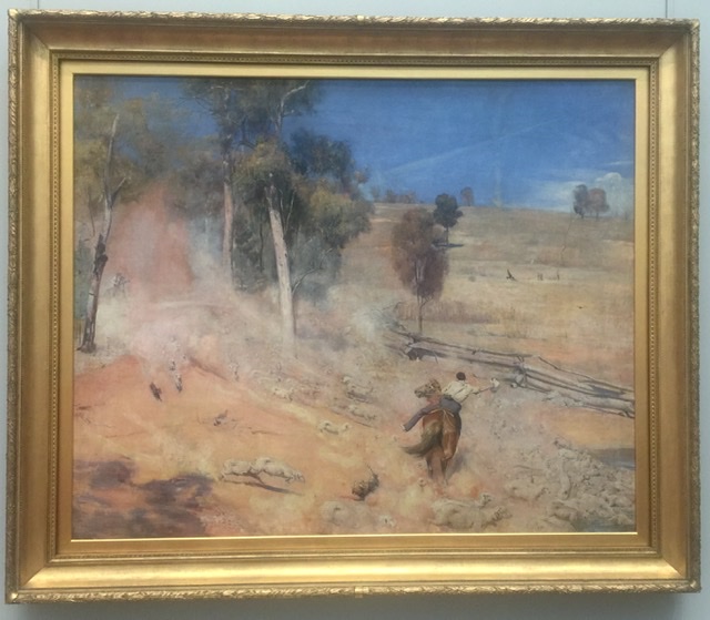 To be fair to Tom Roberts, the composition is dynamic. It is influenced by Augusta Rodin’s interest in creating a figure in motion, as well as Eadweard Muybridge’s studies of motion, both human and horse, using stop-motion film. Rodin’s work, Flying figure 1890-91 in bronze is placed in the same room for comparison.