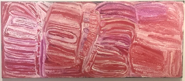 Eubena Nampitjin is from Wirrimanu and her art is derived from life in the Great Sandy Desert where I worked in 1973 for several months. She worked in collaboration with her husband, Wimmitji Tjapangarti, as pivotal collaborative artists with Warlayirti Artists. What we found intriguing is the change in her work once her collaboration with her husband ended due to her husband’s poor eyesight. Her later work Kinyu 2007 exhibits bold strokes with limited but strong colors, abandoning the precise dots of earlier work.