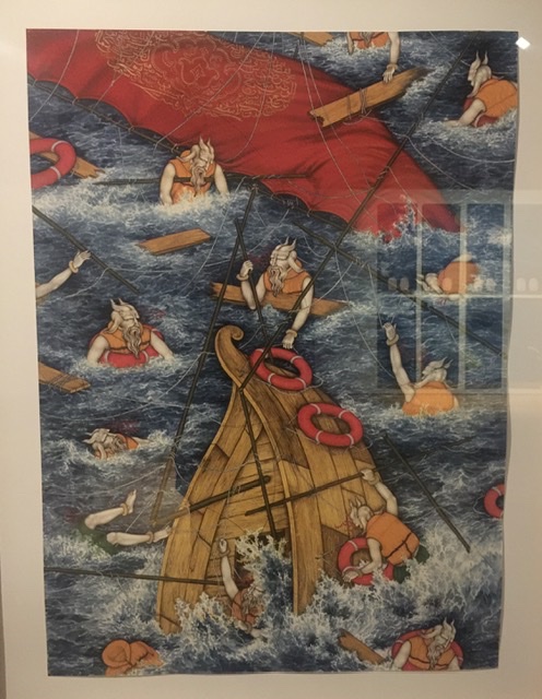 The Australian artist Khadim Ali (of Pakistan heritage) evokes a world of refugees struggling to survive war and dangerous passages as they seek asylum, and how they are seen as demons by others though they simply seek peace and a recognition of their humanity. According to the museum, the style is similar to ancient miniature paintings and the demons refer to characters referenced in stories from the epic Persian poem Shahnameh sung by his grandfather.