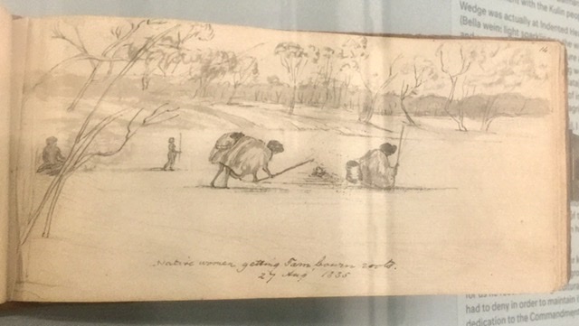 To help dispel the myth perpetuated by the English that the Aboriginal people were just wild hunters and scavengers, the exhibit showcases the digging tools and documented the harvesting practices. The sketch by John Wedge documents the agricultural techniques of the Kulin people as they harvest murnong.