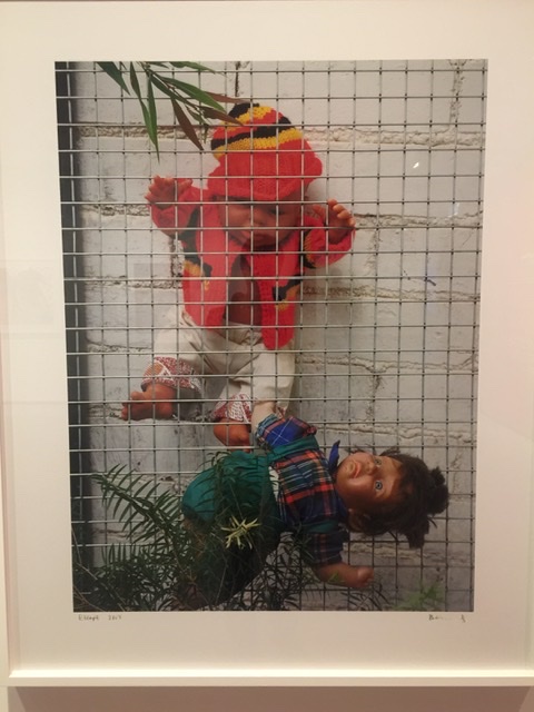 Destiny Deacon (KuKu and Erub/Mer peoples of the Torres Strait Island) showcases her dark sense of humor. This Polaroid work may appear just as dolls in a cage, but references the abuse of aboriginal youth through incarceration. Our initial bemusement in viewing her work turned quickly to reflection.