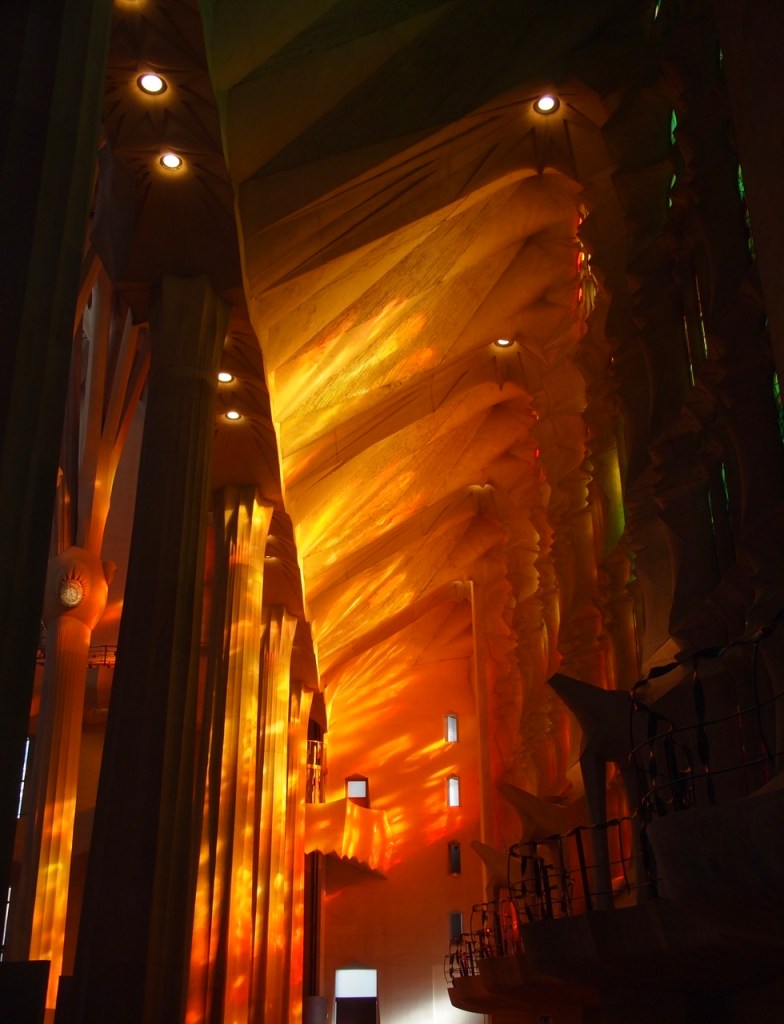 In between, the nave has glorious windows and modernist pillars like trees creating a canopy of light that radiates through the interior. Yet the place has a schizophrenic look trying to project multiple identities. Below the altar is a subterranean chapel where Gaudi is buried, that has a traditional lay out – more evidence of the fits and starts of this project originally begun by Francesc P. Villar in 1882.