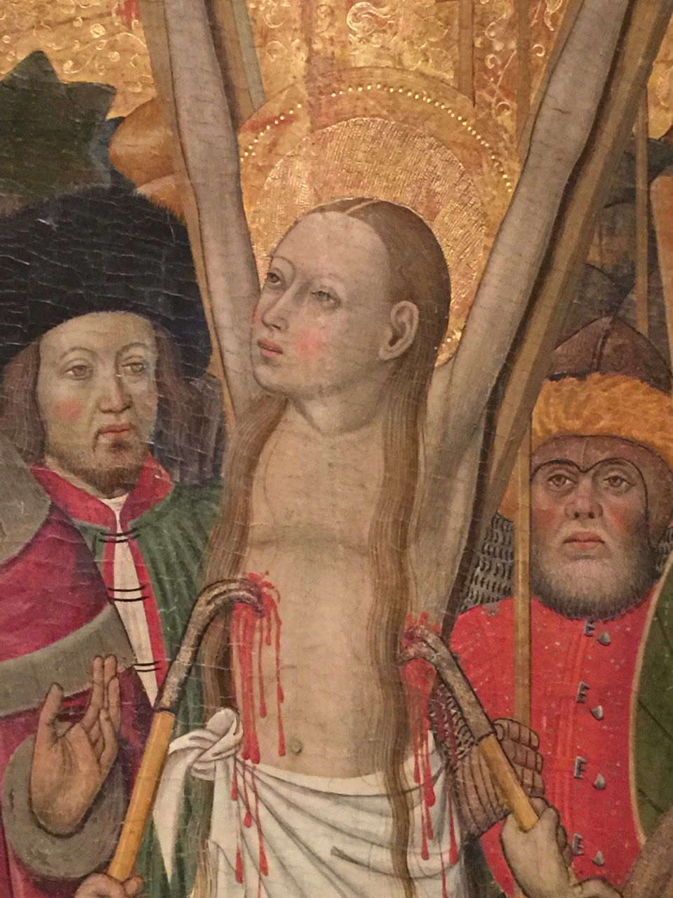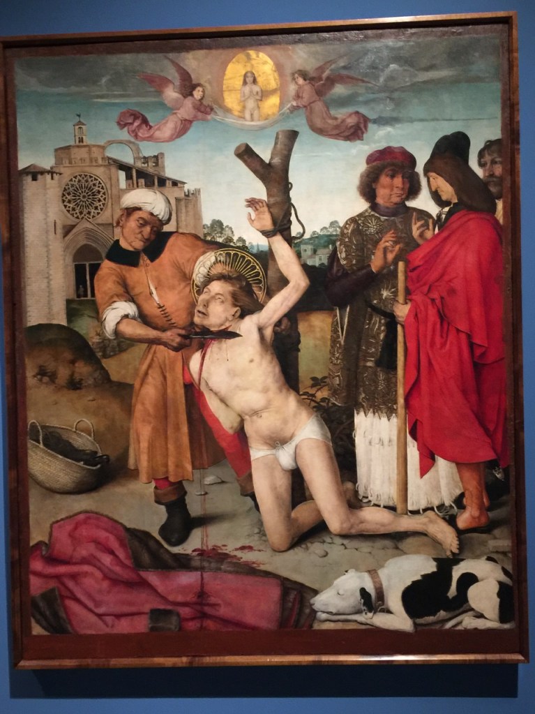 As you move into the galleries of medieval art, you are greeted with the martyrs both men and women being boiled, stabbed, sliced and diced, sawed and decapitated. Mestro de Castelsardo’s Saint Vincent on the Gridiron (and we not talking football), Bernat Martorell’s Martyrdom of Saint Eulalia (1442-1445), Ayne Bru’s Martyrdom of Saint Cugat, (1502-1507) Moving into the early Renaissance, colors brighten but the butchering of martyrs continues but now the figures are depicted more realistically. Their expressions always remain blissful, no matter the affliction.
