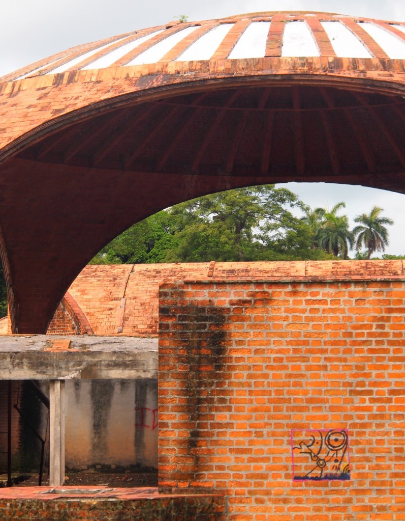 The abandoned ballet school building had arched domes on thin spider-like supports. Broken steps led down into the empty theater. Runnels are designed on top of the walls along the staircase, directing water to cement pools. The theater has a certain post-apocalyptic look. A circular open skylight over the “stage” resembles the hole to the sky in the Roman Pantheon, which should not come as a surprise since two of the architects were Italian. Ribbed arches support the brick ceiling. Stagnant water pooled in the circular performance space. I felt sorry for the architects, not seeing their work completed…and for the building never to have the opportunity to showcase beauty as intended.