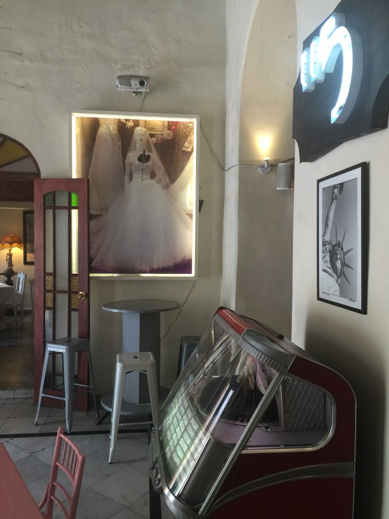 Lunch was at the Prado 115, a very “hip joint”. Art everywhere and an old jukebox sat in the front room. One particular piece struck all of us as peculiar. It was a photo of a woman in a white dress with what appeared to be a real sword sticking into the image. Please explain. Though the chicken was tough, – hey it is hard scratching out a living in these surroundings – the pumpkin soup was delicious and the lemon pie was not deconstructed. Michele had the ubiquitous flan.