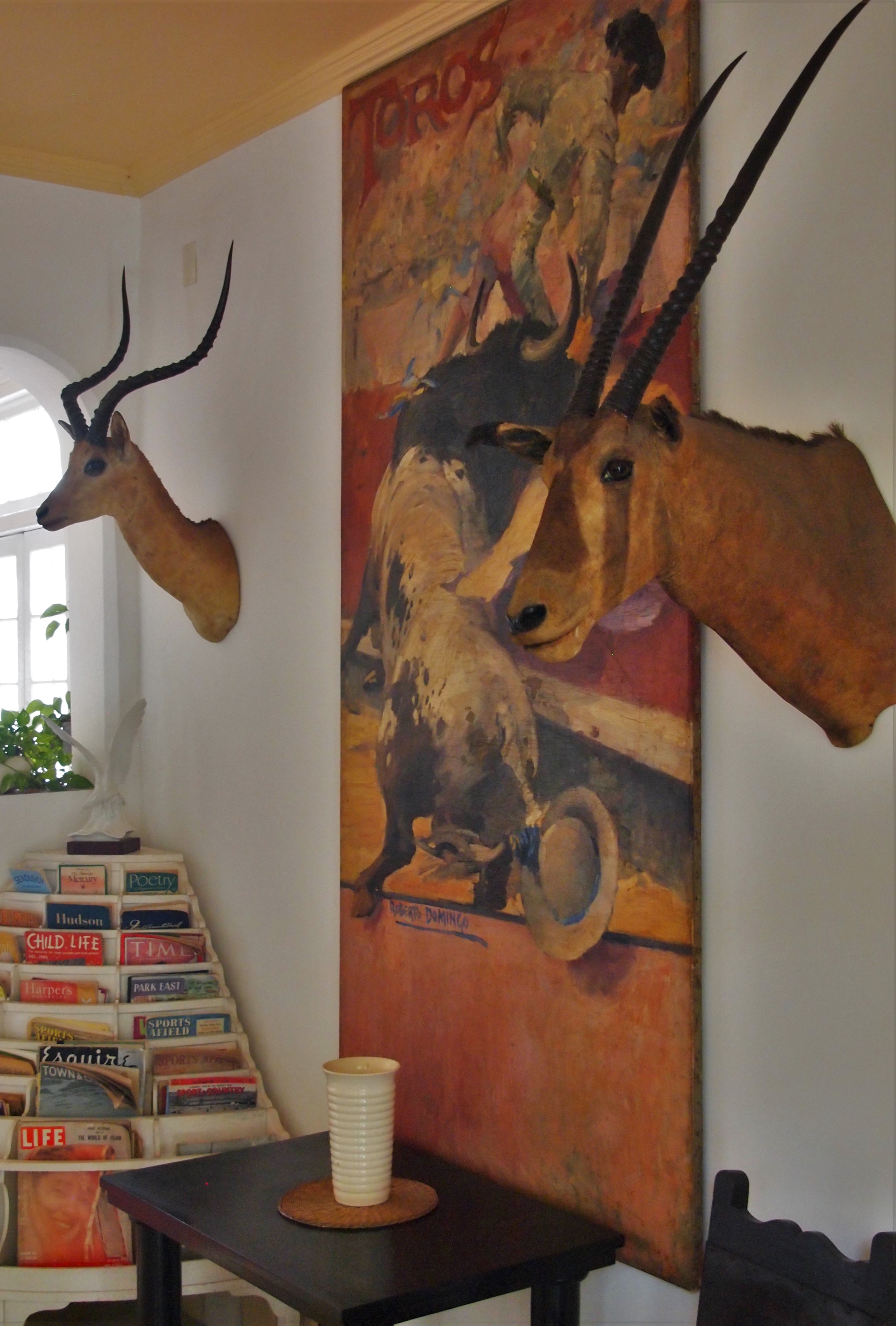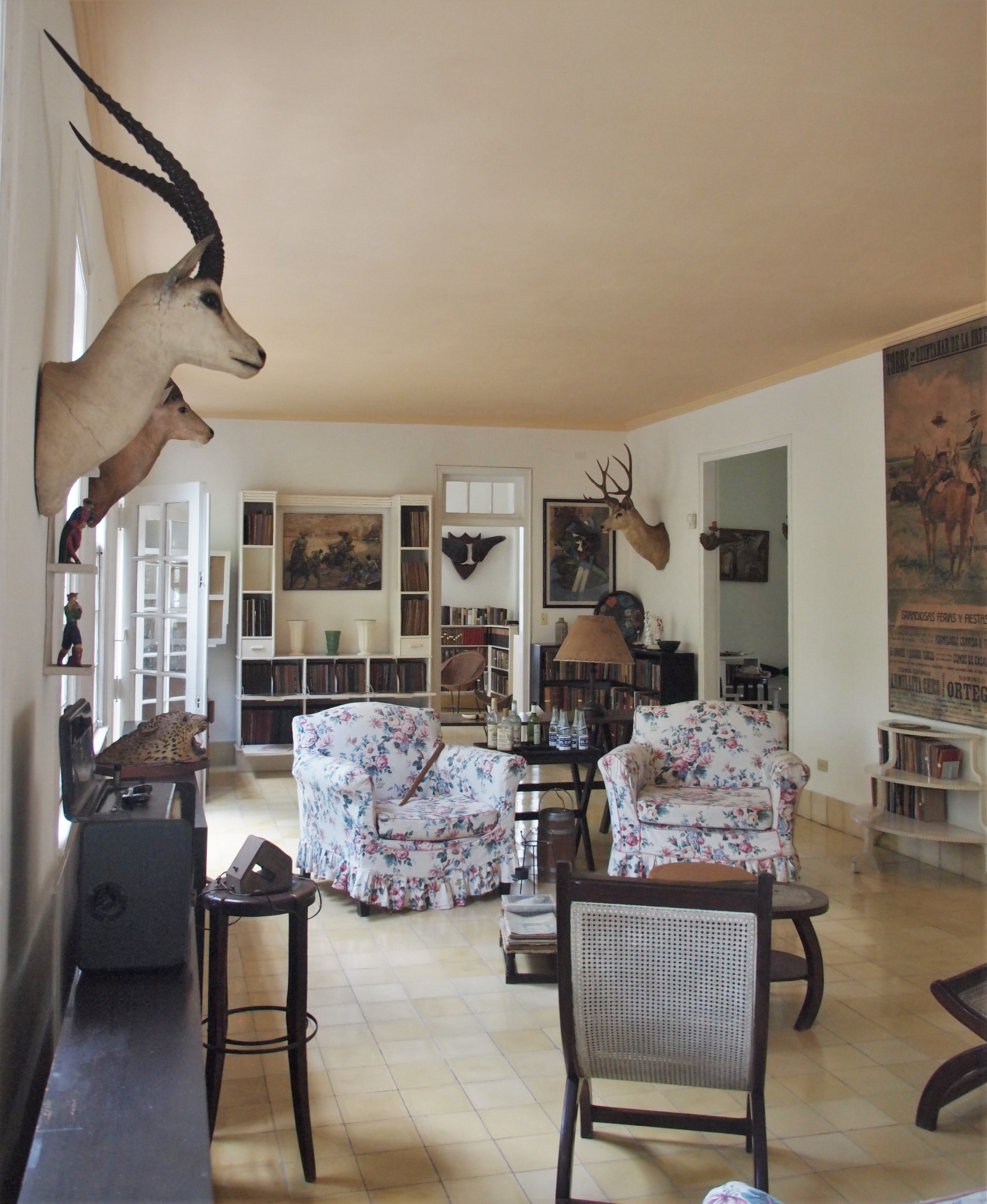 Situated up on a verdant knoll, the house is an incredible set-up for a writer. Large grounds, beautiful views, large swimming pool and an open-air house filled with books, magazines, stuffed animal heads staring at you and various art pieces and posters on the walls. Adrian claimed that this layout and the furnishings were all original. We could not enter the house, only lean in over the cordon. Up in the tower, was a small writing desk and typewriter…a tree house above the retreat below. You could not get more isolated from the Havana bars and plentiful rum than here…and still be within easy commuting distance of Havana. This must have been the Good Life. I need a writing tower.
