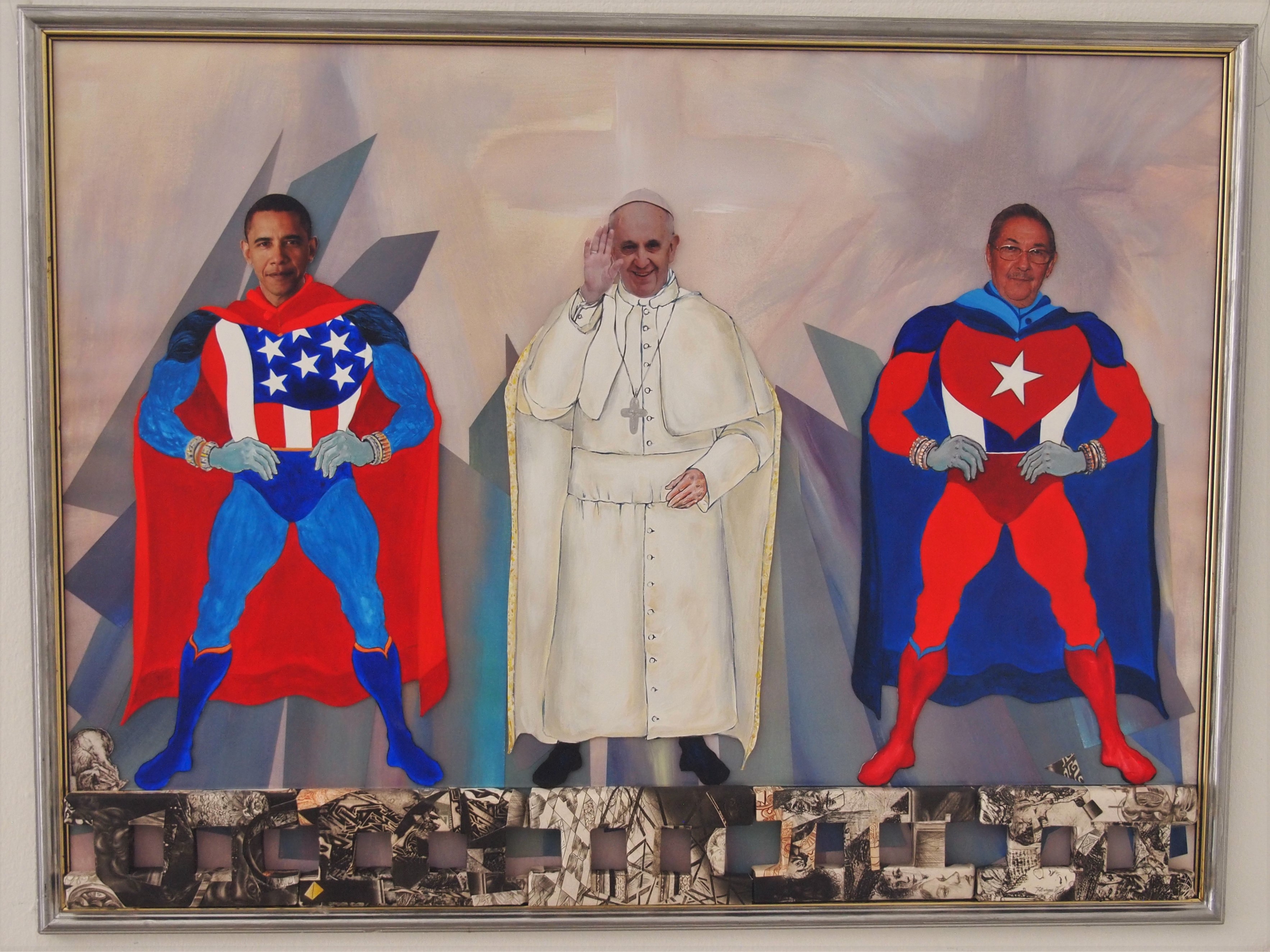 Humor relieved my dark foreboding. On the wall of the Tallar Experimental de La Grafica studio gallery were several references to the relationship between Cuba and the US. Obama and Raul Castro appeared in comic hero costume, flanking the Pope.