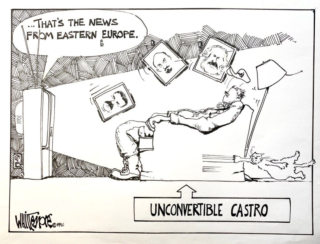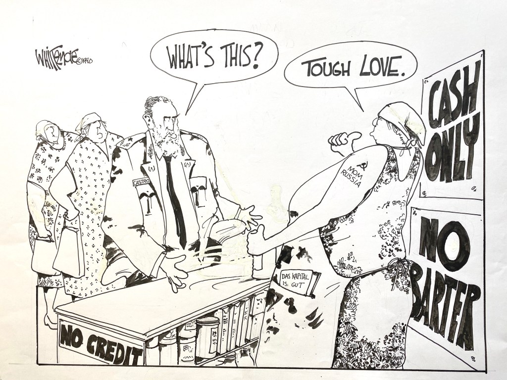 I spent some time producing free lance editorial cartoons in Chicago and then in Seattle, and did a couple of toons on the collapse of the Soviet Union and the loss of support from Russia for Cuba. We would learn later this was labeled the “Special Period”. It was a bleak period.