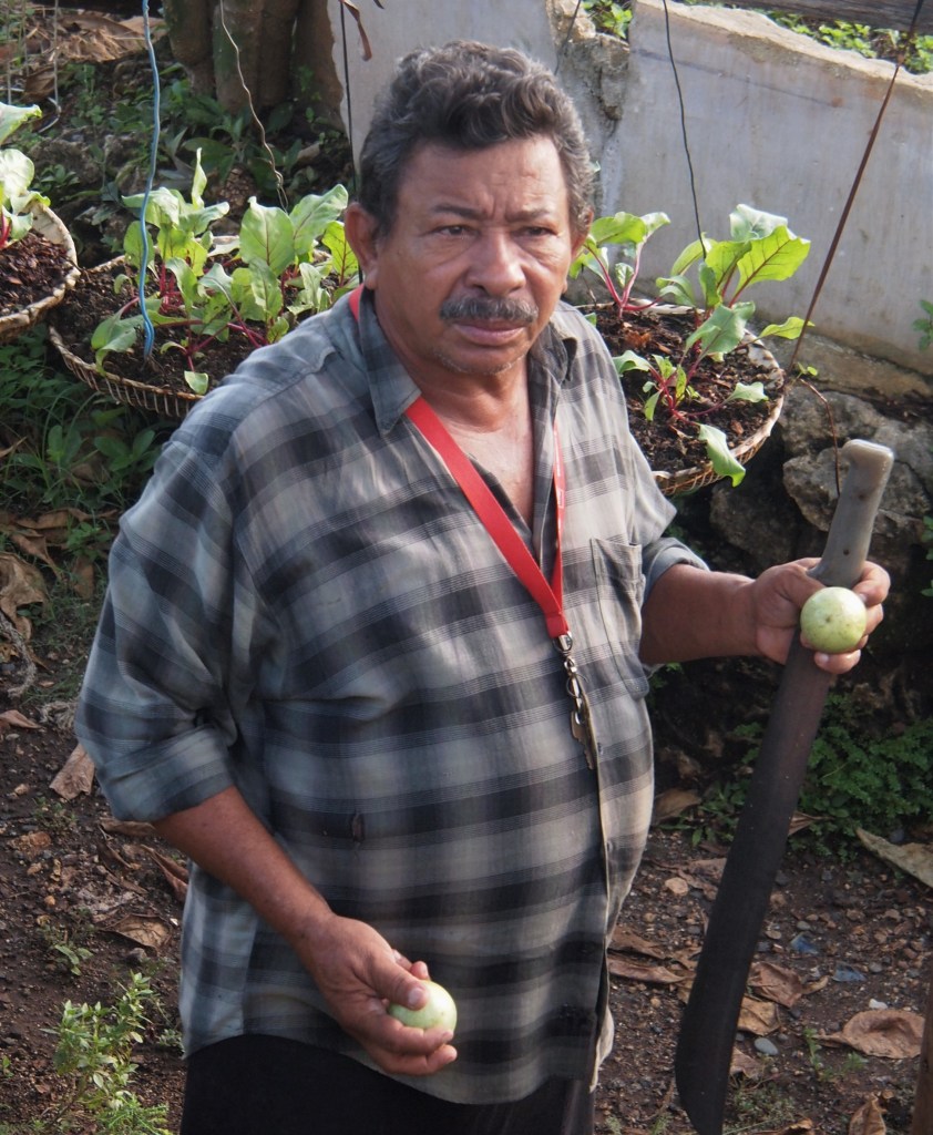 Around the point on the bay side we came across a garden below the wall. In chatting with the gardener, we learned this was a reclaimed dump site transformed into an organic oasis. He had raised beds and hanging beds made from old fan guards. The site produced mint, lettuce, guava, papaya, bananas and more. In the bay sat the fishing skiffs with masts and booms, and small outboard motors.