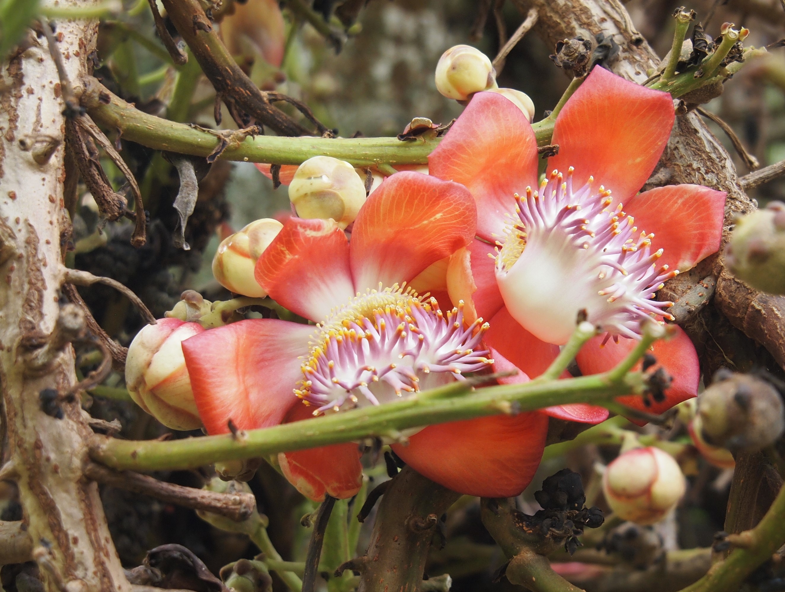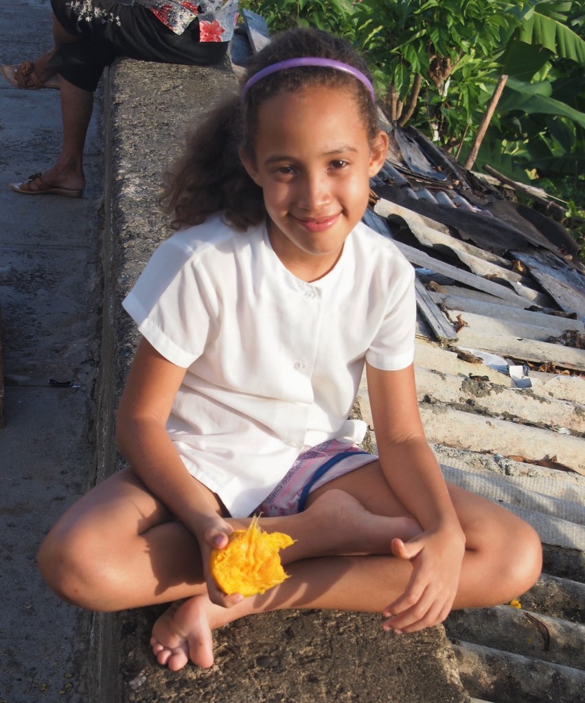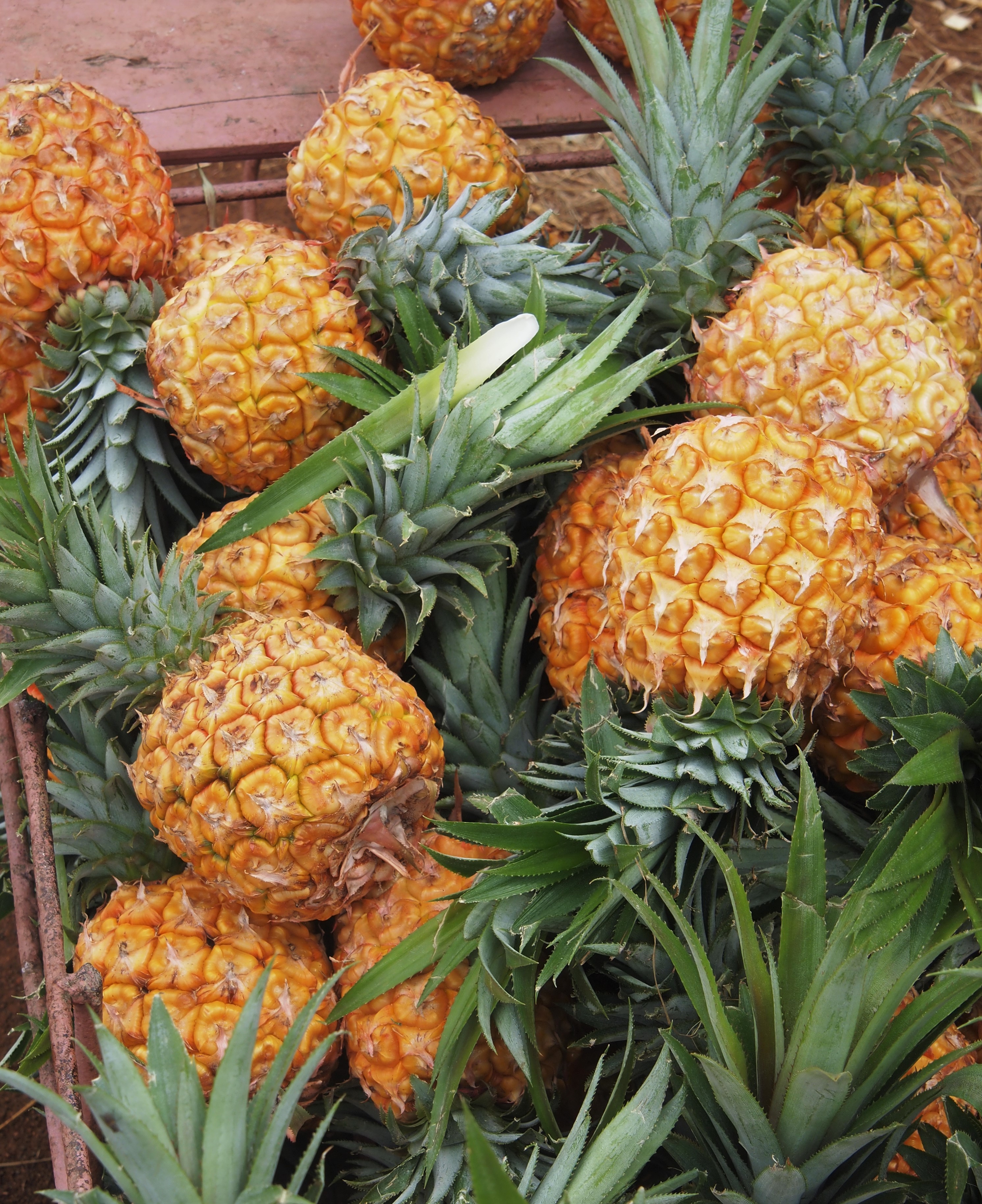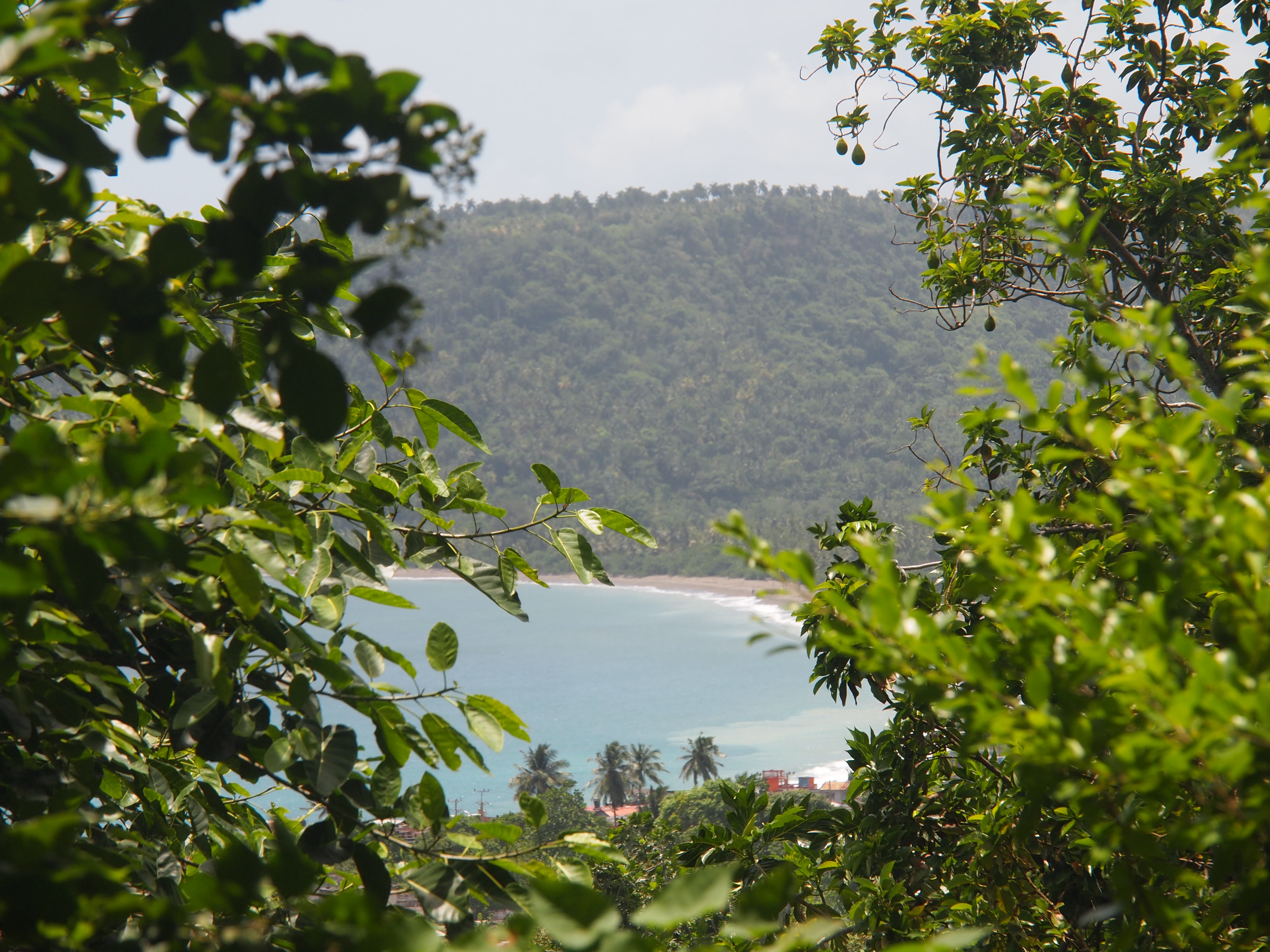 Heading onto the mountain road, George took it slowly since this route was known for rock falls. He leaned forward in his seat as he drove to peer around the corners. This of course got us craning our necks to see around corners. A few fruit sellers hung on around the road’s edge, eking out a living on these precipitous slopes. At one view point, bananas and mangoes looked tempting but we were keeping our stomachs intact. One official road-stop at the pass and we started down. The vegetation changed dramatically. The whole landscape appeared as some Shangri La paradise hidden from the world. Palm trees mixed with Pines, and as we descended further the variety of plants increased with cocao trees appearing in the lush forest.