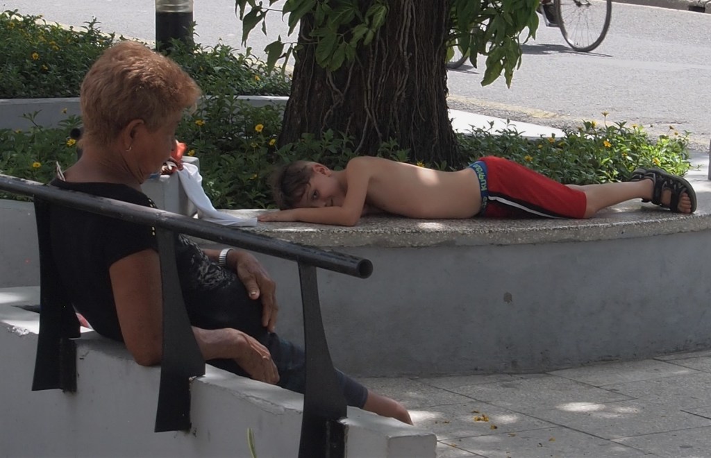 My afternoon was for wandering as Michele hunkered down. I paused at Plaza del Christo to watch the kids spinning tops, while young girls swarmed over a table to gab. Some youth kicked a ball around. Young boys were singing and yelling over a microphone in the church. While this all seemed raucous, an older woman sat in the shade with her cart of treats…waiting for sales.