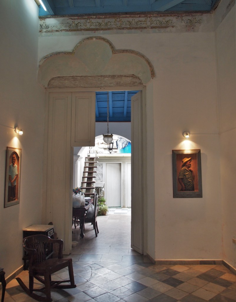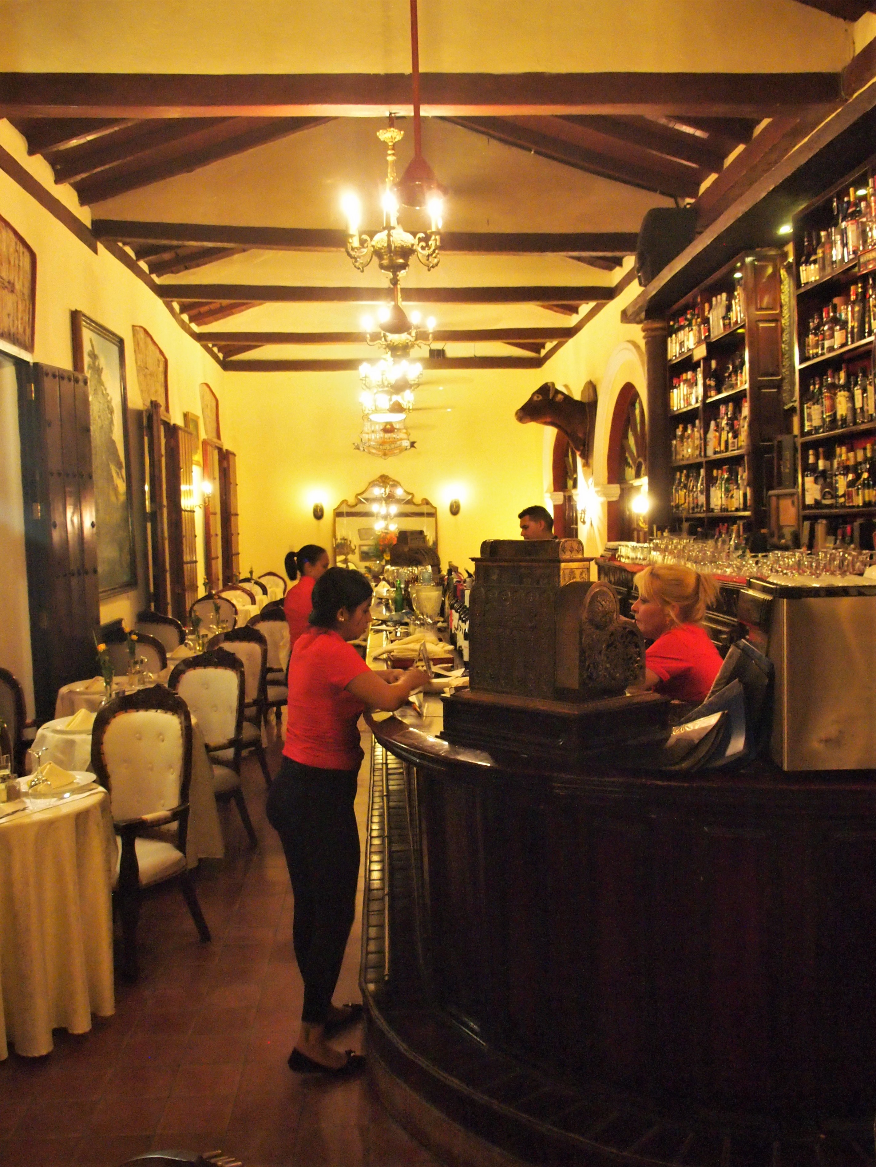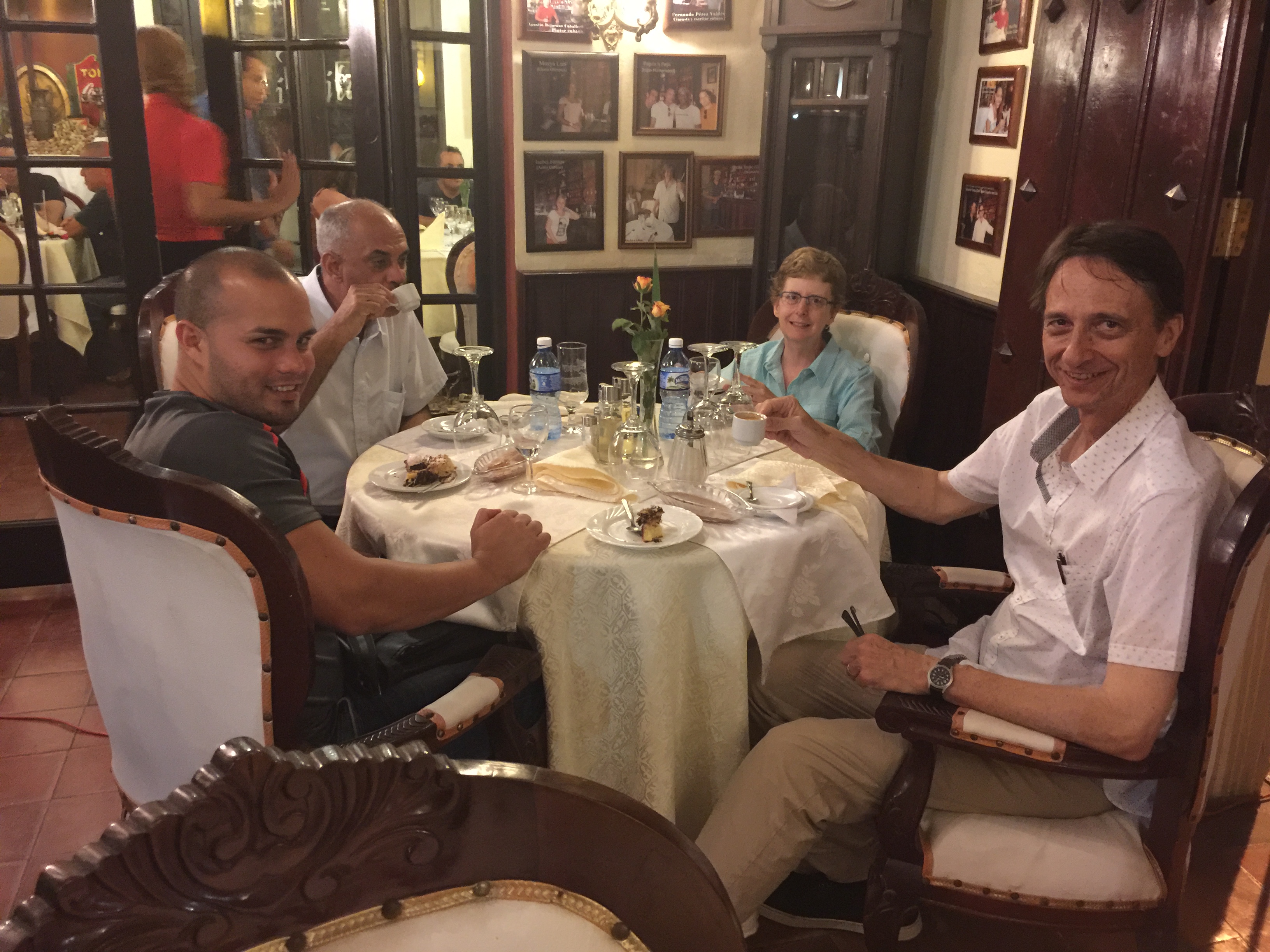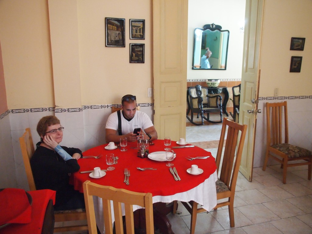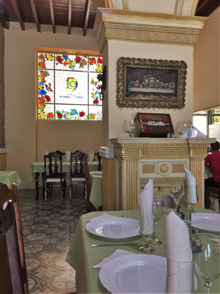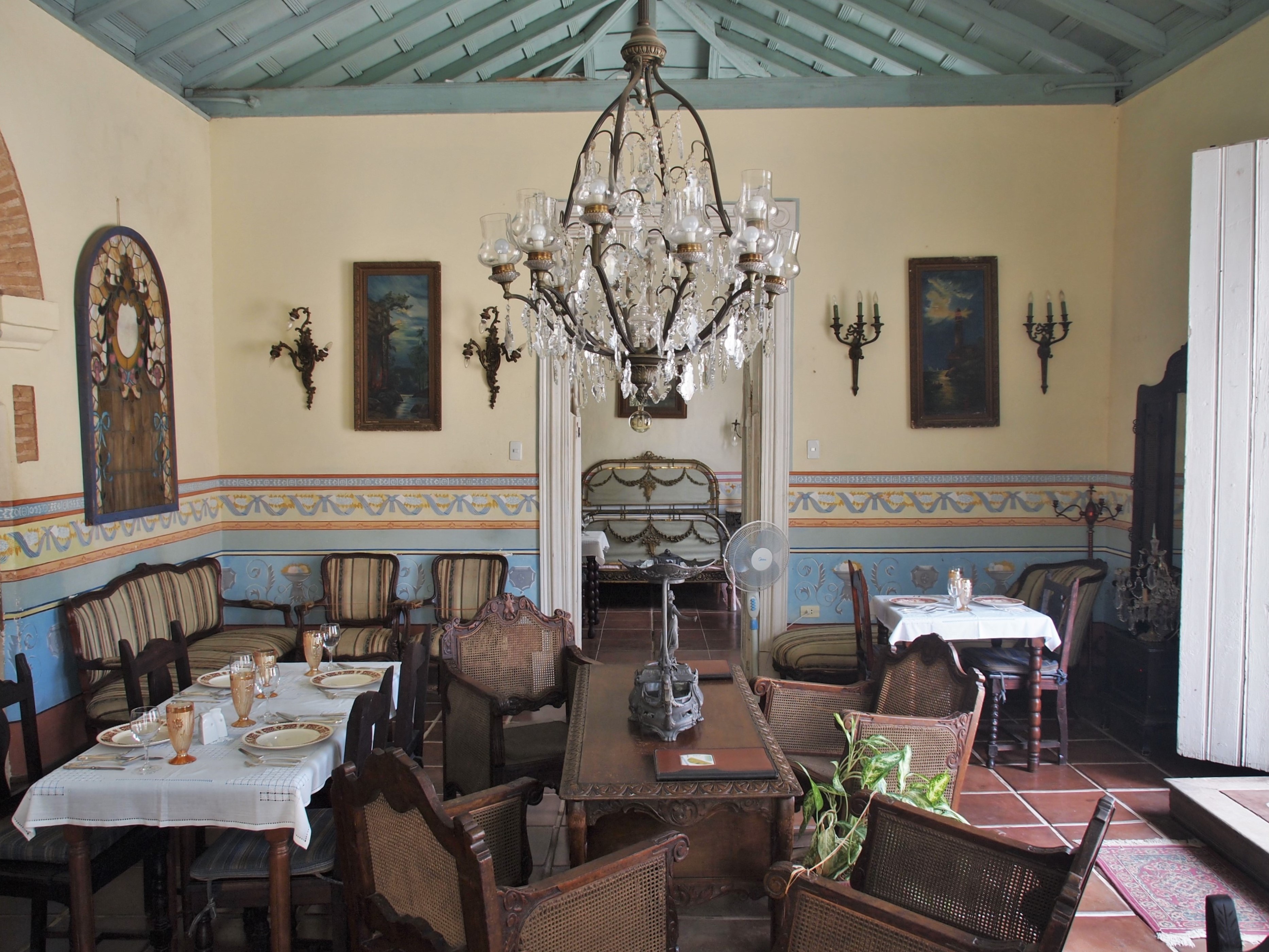 A Taxi charged 7 CUCs to get to the paladar. No arguing. He got us there and we had no clue as to the going rate. On arrival I felt a bit underdressed compared to two swanky looking couples headed up the stairs to the restaurant. Michele assured me that all dress was acceptable. Power to the People! Climbing several flights of stairs was not that encouraging since one floor seemed in complete disrepair, with support posts seeming to hold up an old structure yearning to crumble. Entering the restaurant gave me hope, though thank goodness we did not get seated on the balcony. What was holding it up?