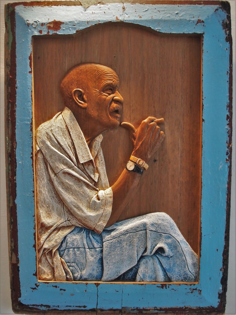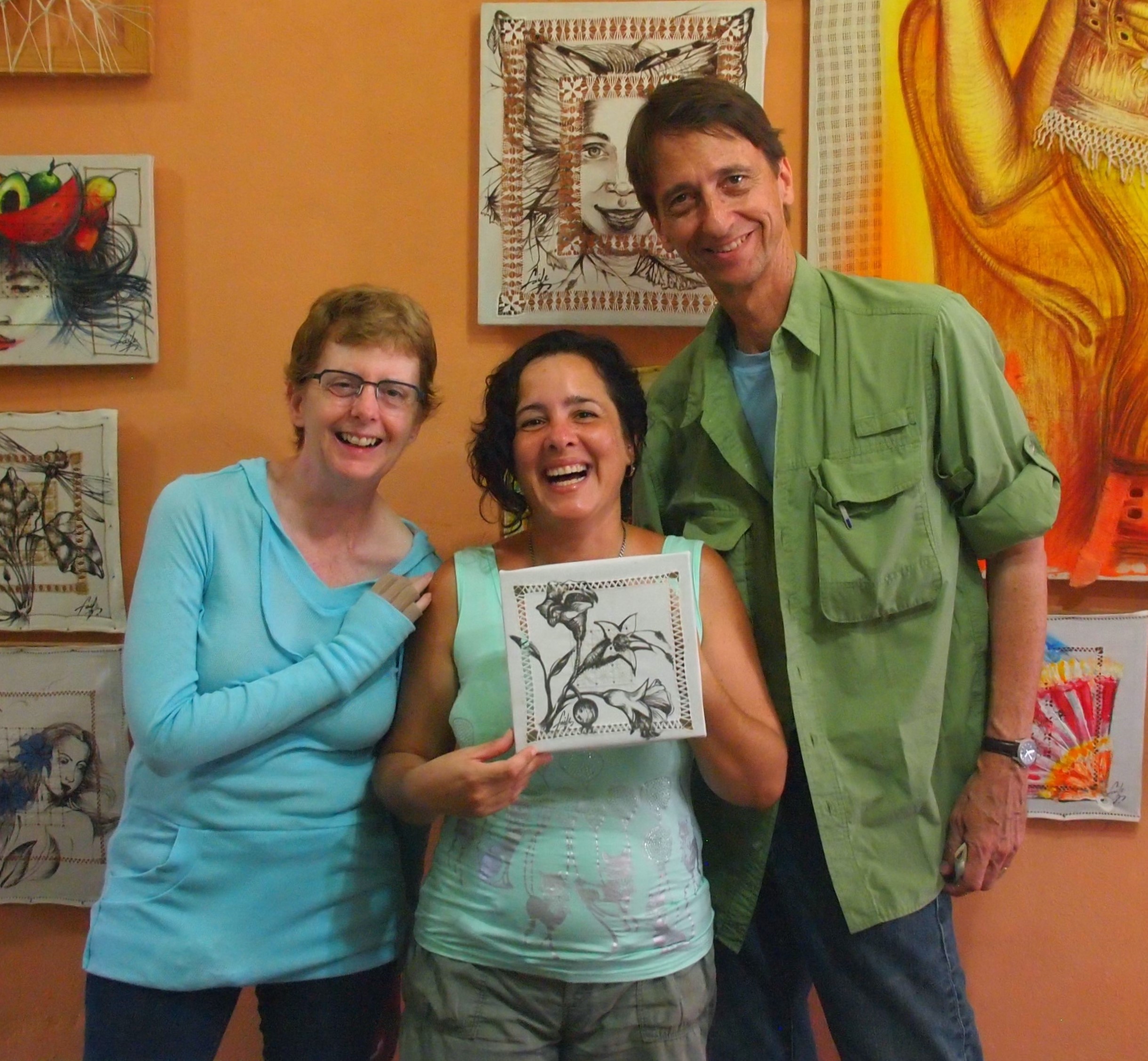 Now we were ready to buy a painting. We looked over multiple canvases in one artist’s home and finally settled on one. The artist insisted on getting us a certificate authenticating the purchase ($10 CUCs) and I realize I was going to need more money for this transaction. Leaving Michele to mix it up with the artist’s wife and son, I raced up the steep staircase (passed to forlorn lovers hugging on a step), to our room, dropped off our bag, picked up $300 US and dashed down past the hapless lovers. Casio Cambio looked closed, but the manager took pity on a desperate gringo. While they processed the transaction, he and I talked of the beauty of Baracoa. He owns his own paladar. Apparently, the City (or Cuban Government) was considering digging a deeper channel to the bay and building a new dock to accommodate cruise ships. Be careful what you wish for. Transaction completed, we shake hands “cool” style (two stage version) and off I went to find Michele. I found her communicating with the artist’s wife and son as she looked over all the canvases. No common language just gestures with “ums” and ”ahs”. The son is also doing some of the work. His dad finally arrives with certificate in hand and we walk away with a tube of rolled up Cuban art.