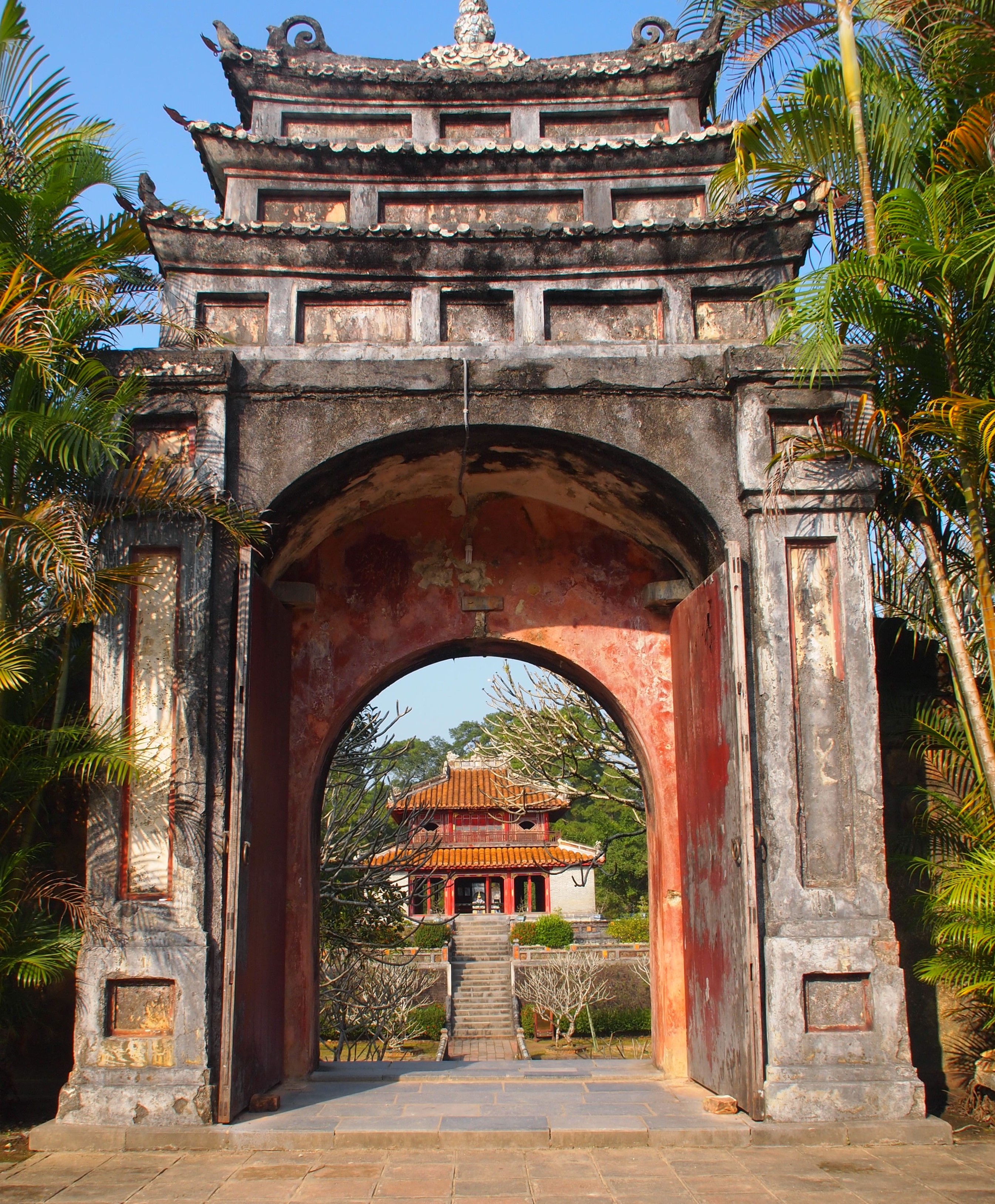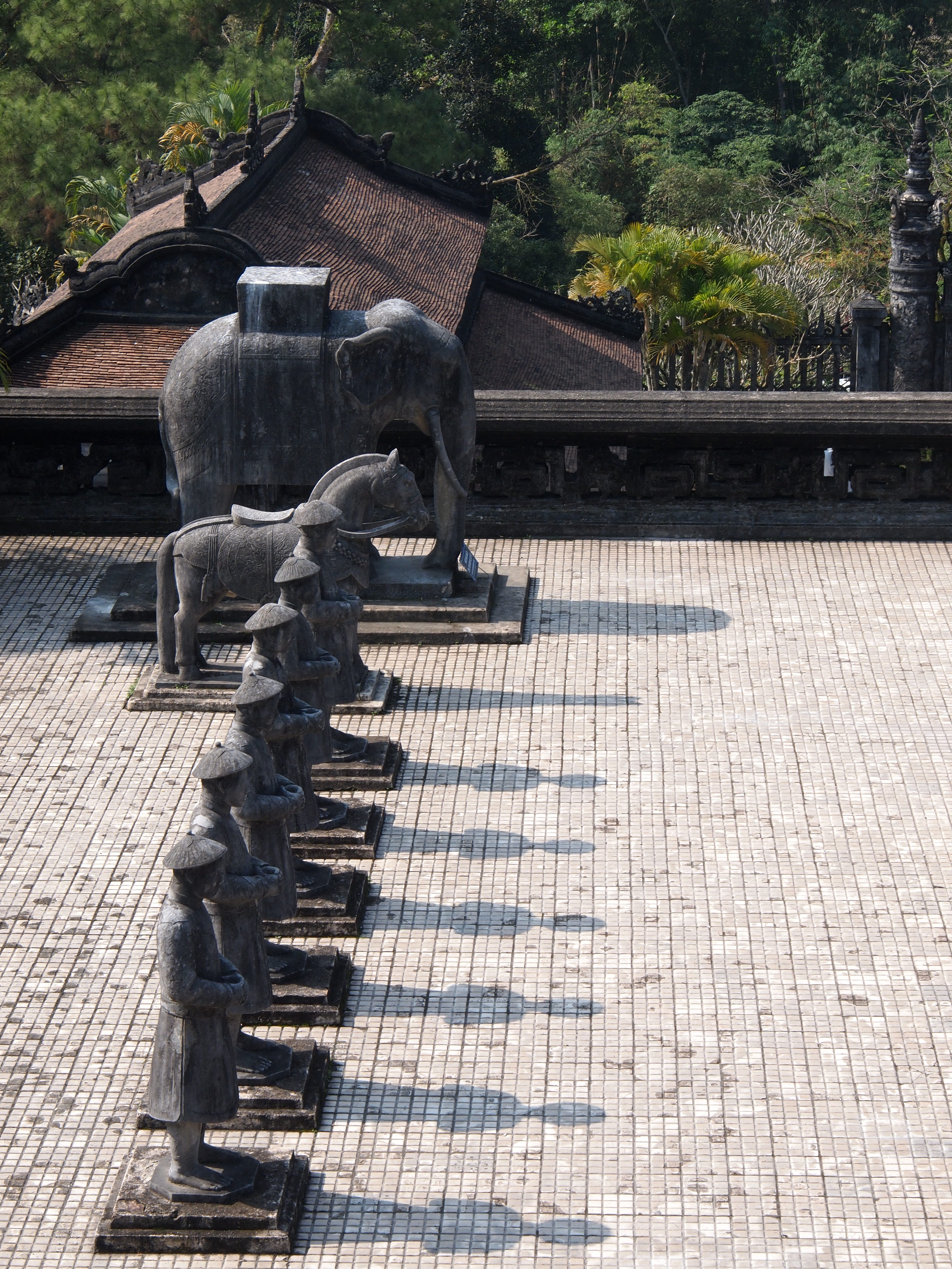 Minh Mang includes a park like setting with constructed ponds and hills designed as a heaven on earth. One hill holds the sepulcher and the gate to the underground is opened once a year. Tomb Raider territory for sure. We were alone with the guardian statues until the first bus load of tourists cracked the silence.