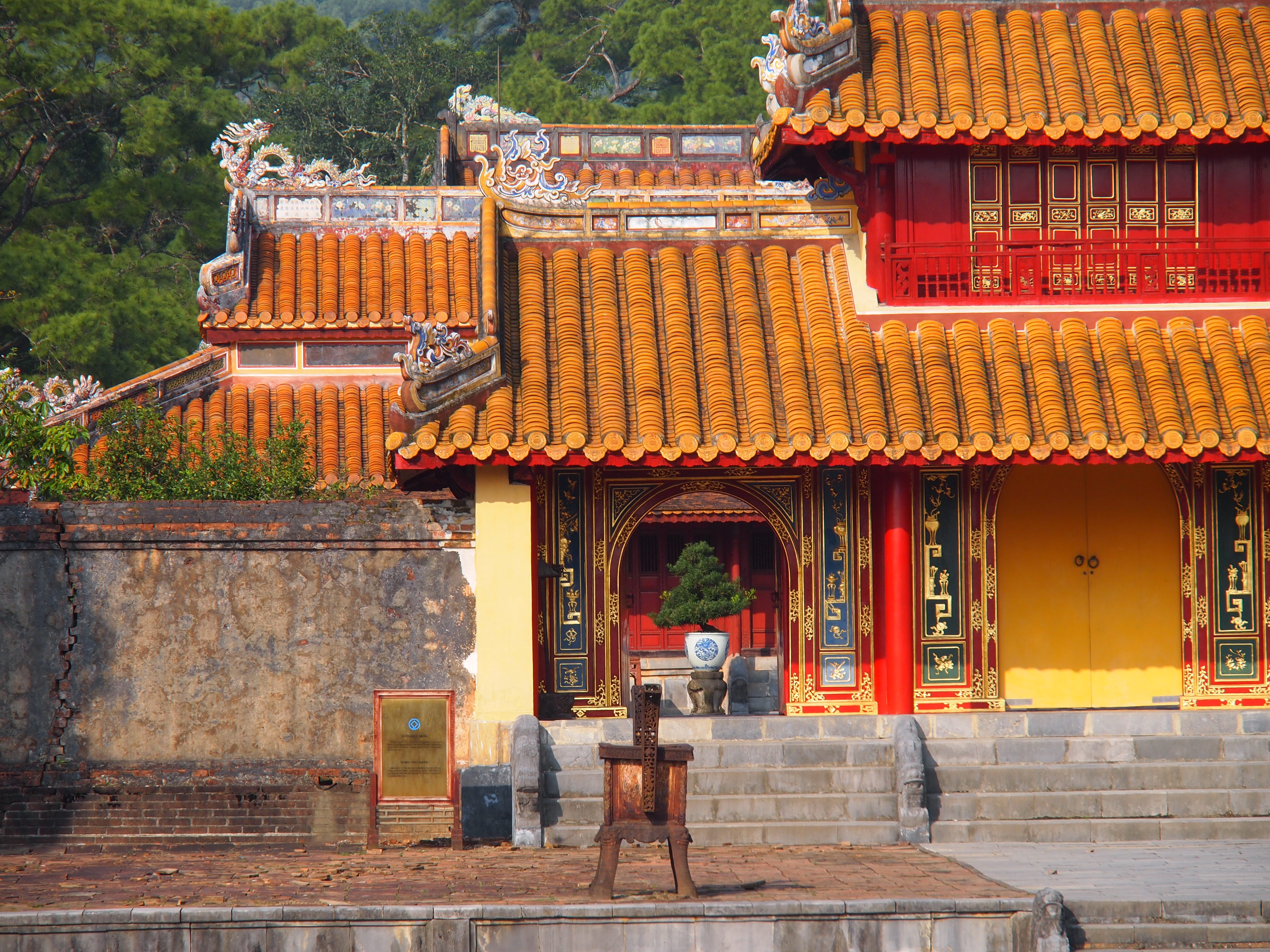 Foundation outlines hint of structures long obliterated. In some niches you can sense the splendor and extravagance of the royal presence: the Throne room with poetry painted on the beams, the nine large dynastic urns with molded iconic images of clouds and rain at the Pavilion of Splendor, the Queen Mother’s residence, Dien Tho Palace with the Truong Du Pavilion over a lotus filled pond. Though passing an old bomb shelter tempers the thrills.
