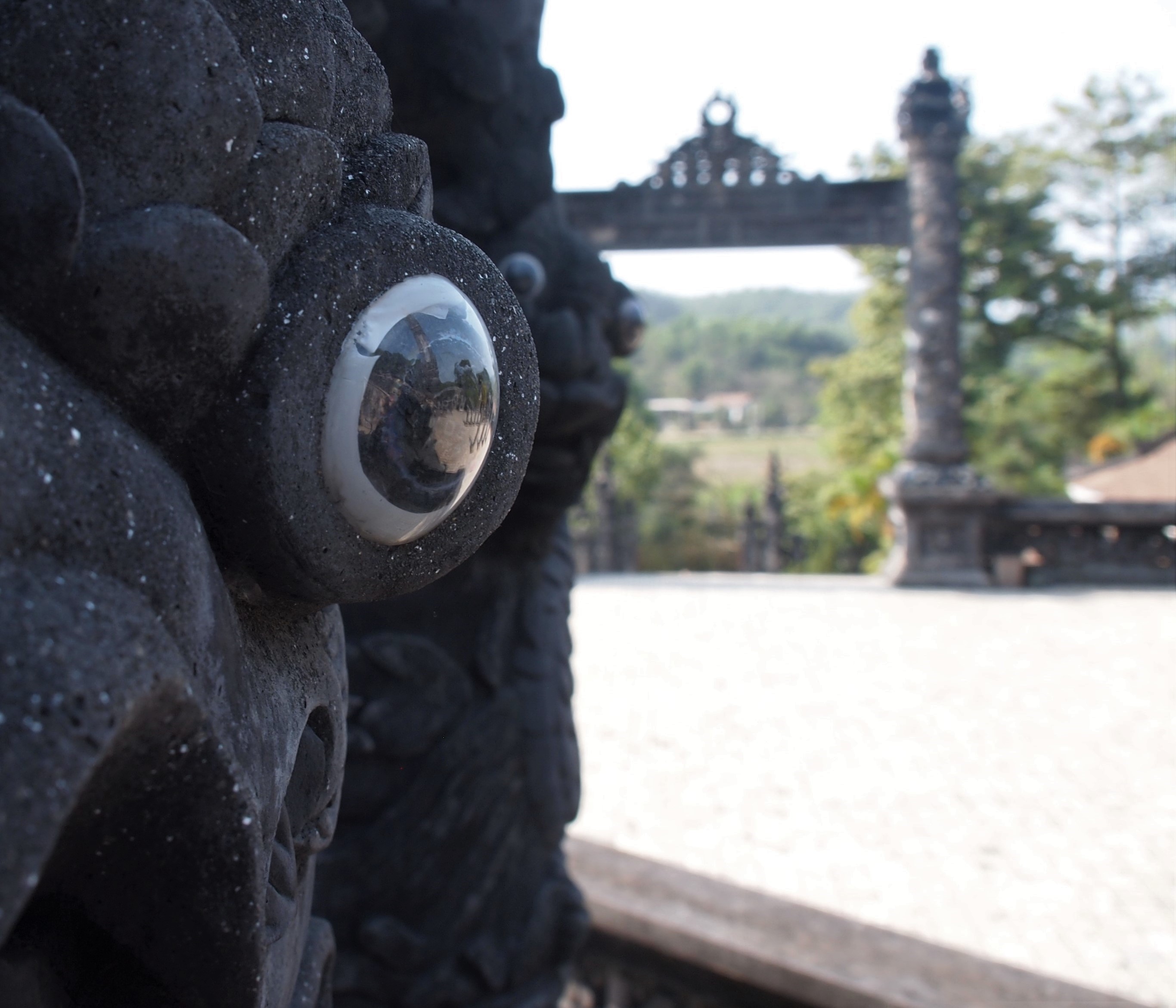 Grey stone statues of mandarins and animals were the honor guard positioned on either side of the walk up to Khai Dinh. They loomed over us as we passed from one steep stone staircase to the next. The tomb showcased over-the-top rococo style interior spaces.