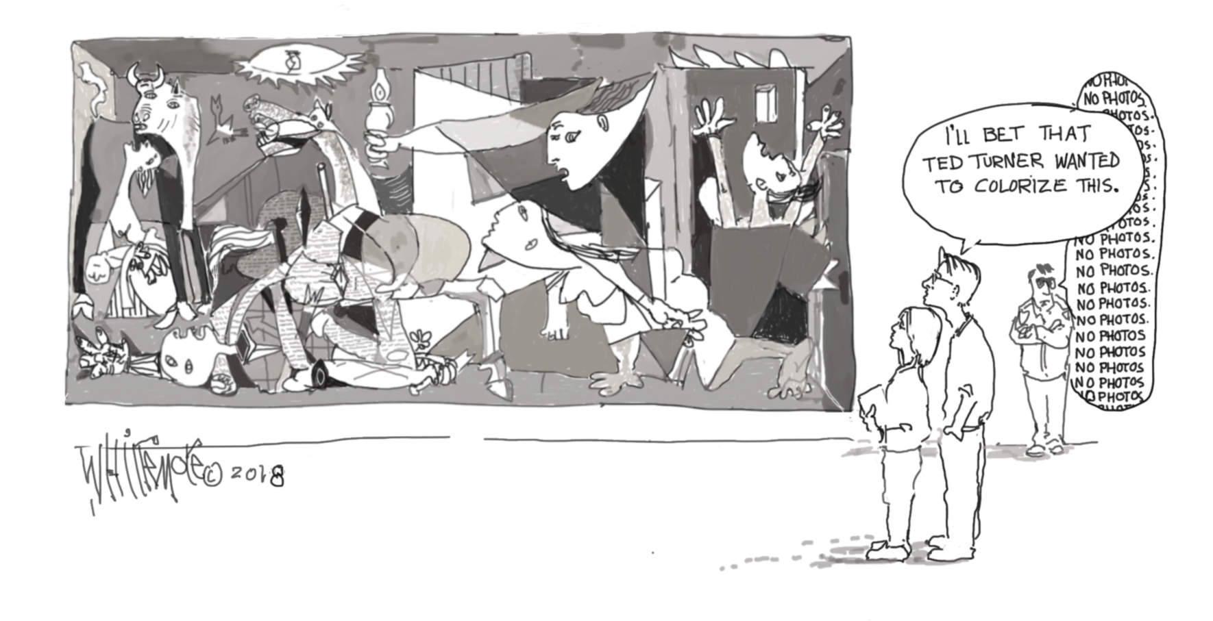 Added to the main event, are paintings and photographs showing the process of development of the work and images of weeping women in bold color. This side show allowed me to understand Picasso’s creative process a bit. One photo series showed changes in Guernica as it was painted, letting me imagine Picasso’s decision making process. Though trying to get inside Picasso’s head might be hazardous to your health.