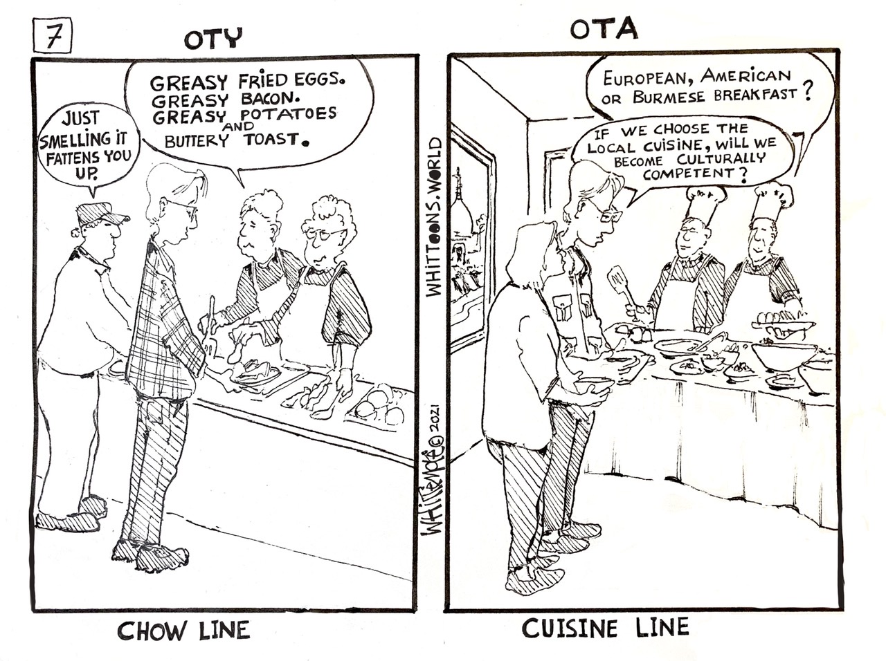 OTA: I had the tools, and I was ready for the challenge. The wooden chopsticks were an extension of my fingertips, responding to my sensitive touch. The spoon was at the ready to scoop in the broth as I displayed tremendous ambidextrous culinary sophistication. The waiters lined up like Olympic judges checking on our every move. My reputation as a culturally competent epicurean was at stake. What if we got invited to the Captain’s table and I slurped broth across the table cloth? The noodles were not responding to my commands. Like a pit of vipers, they fought me at every stab. Fork Please.